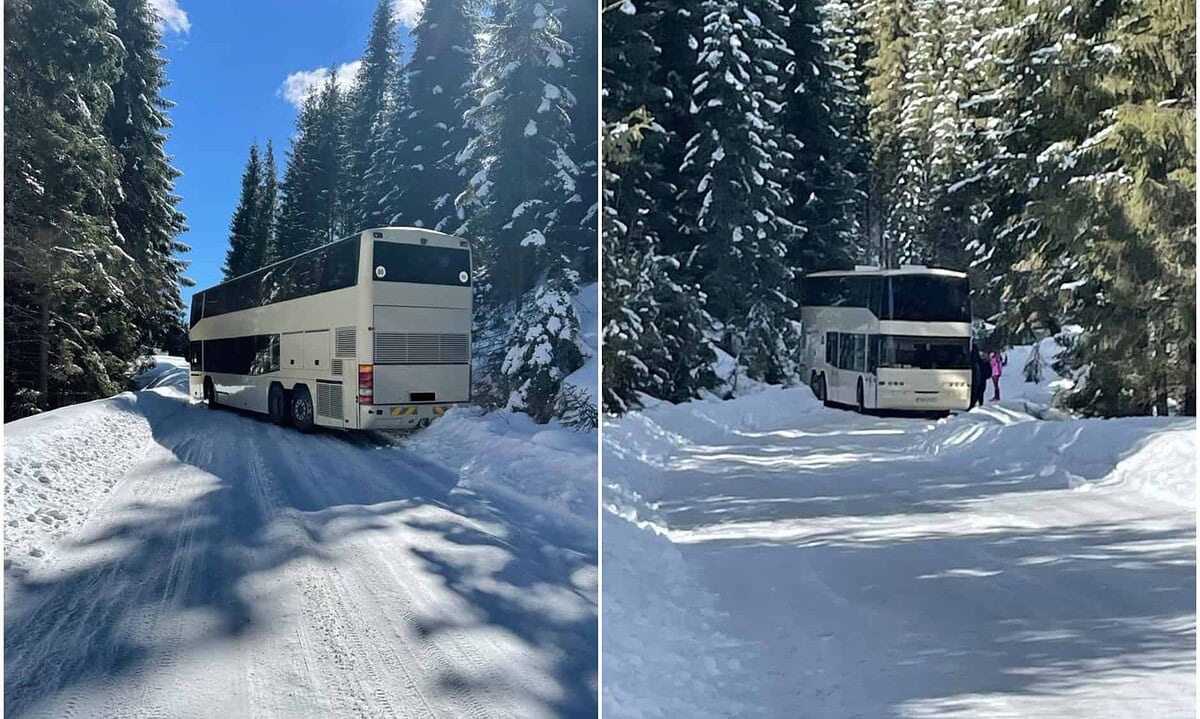 UPDATE FOTO: Circulație blocată pe drumul spre Șureanu. Un autocar a rămas înzăpezit, între barajul Oașa și Mănăstirea Oașa