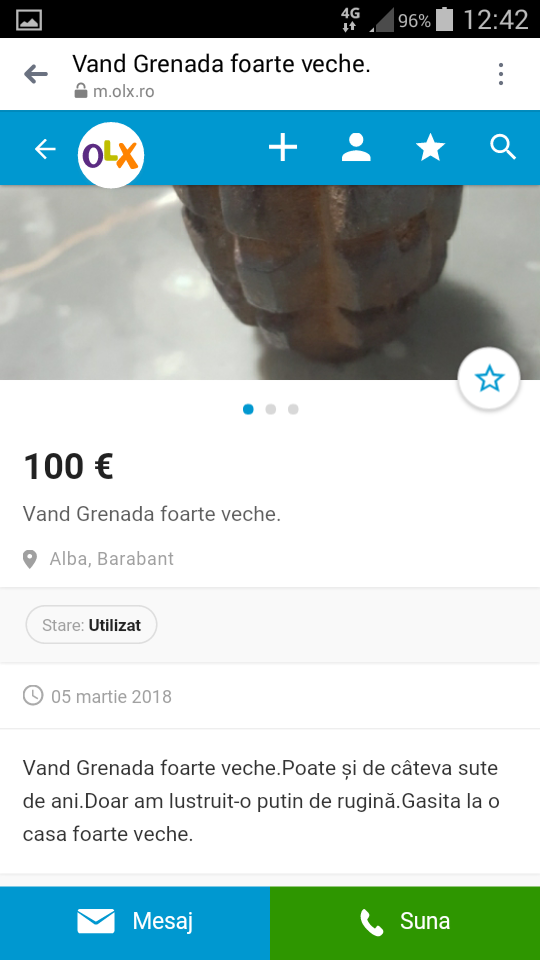 Prețul solicitat pentru grenadă era de 100 de euro. ”Oferta” a fost postată în data de 5 martie, ne-a anunțat un cititor Alba24. Vineri, anunțul a dispărut de pe site, semn că cineva o fi ”sărit” cu banii.