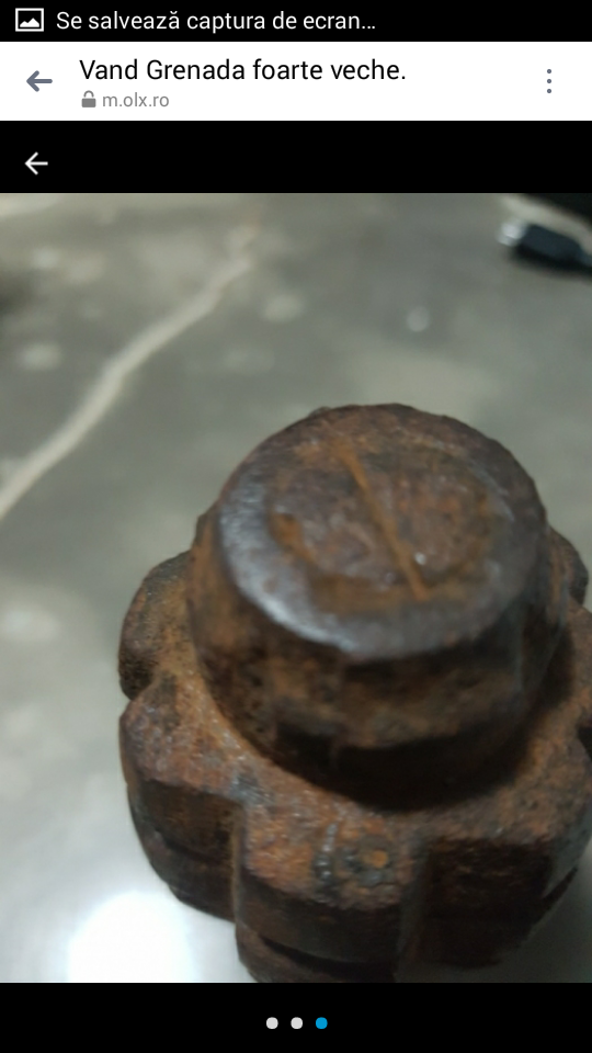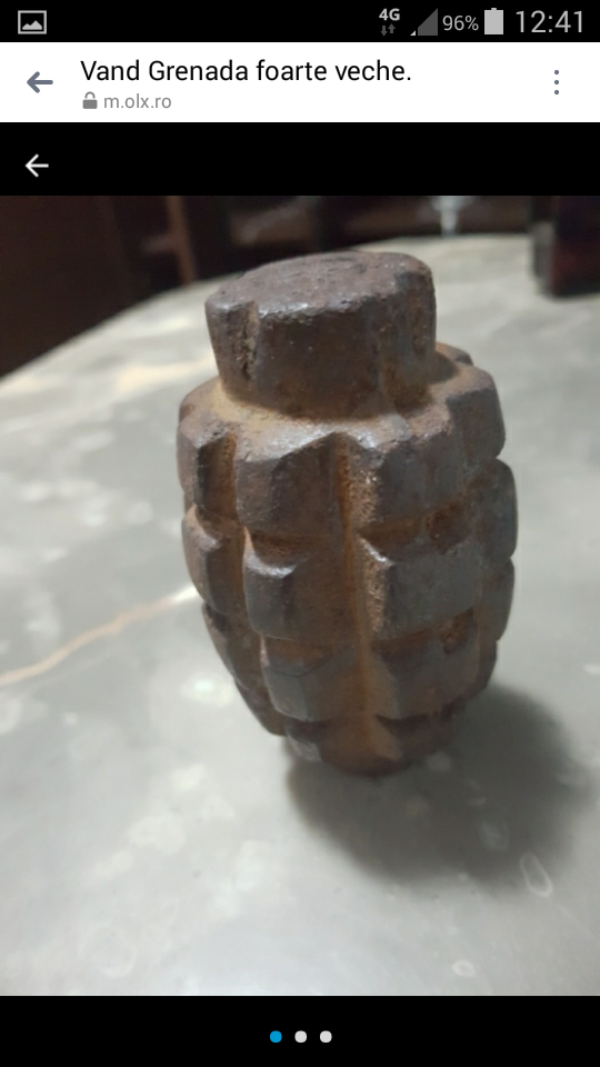 Pe un site de anunțuri a apărut o ofertă mai puțin obișnuită: o grenadă! ”Vând grenadă foarte veche. Poate și de câteva sute de ani. Doar am lustruit-o puțin de rugină. Găsită la o casă foarte veche” suna anunțul postat pe internet de către cineva care a scris că locuiește în cartierul Bărăbanț din Alba Iulia. Acesta mai are de vânzare o geacă Gucci veche, un telefon spart, un laptop defect și un set de roți.