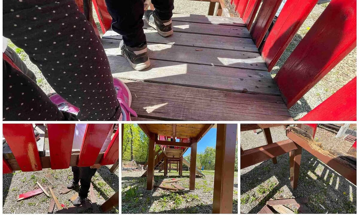 FOTO ȘTIREA TA: Incident la un loc de joacă din Alba Iulia. Un copil a căzut prin lemnele putrede ale toboganului