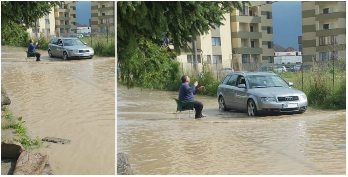Un albaiulian cu simțul umorului a ieșit cu un scaun și o undiță în mijlocul străzii, la pescuit. Fotografia a fost surprinsă de un cititor Alba24.