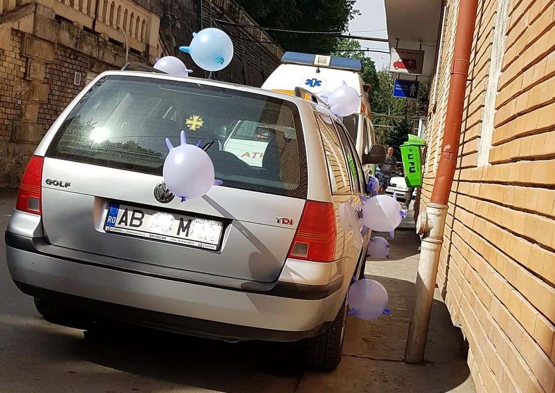Un albaiulian care a ocupat cu mașina locul destinat ambulanțelor, la Unitatea de Primiri Urgențe din Cluj-Napoca, a fost „atenționat” într-un mod inedit. Autoturismul cu număr de Alba a fost „împodobit” cu baloane realizate din mănuși de unică folosință.