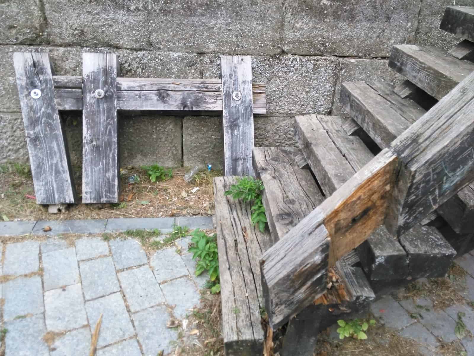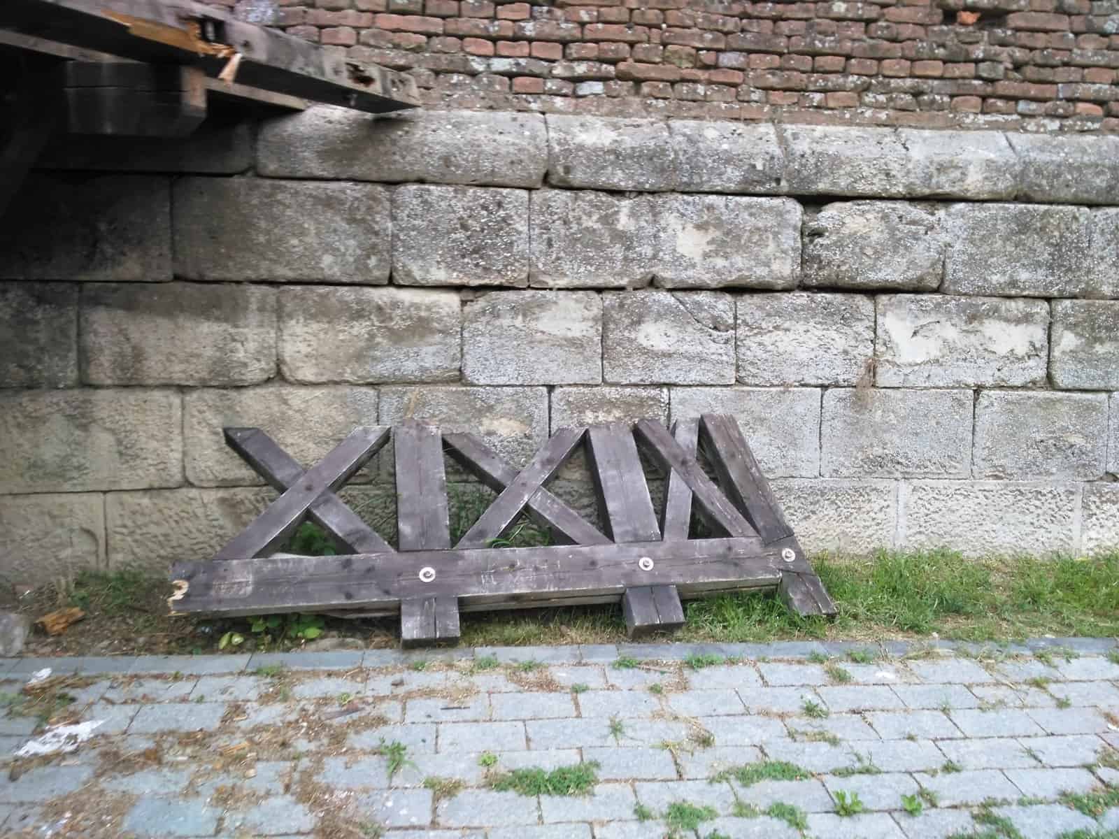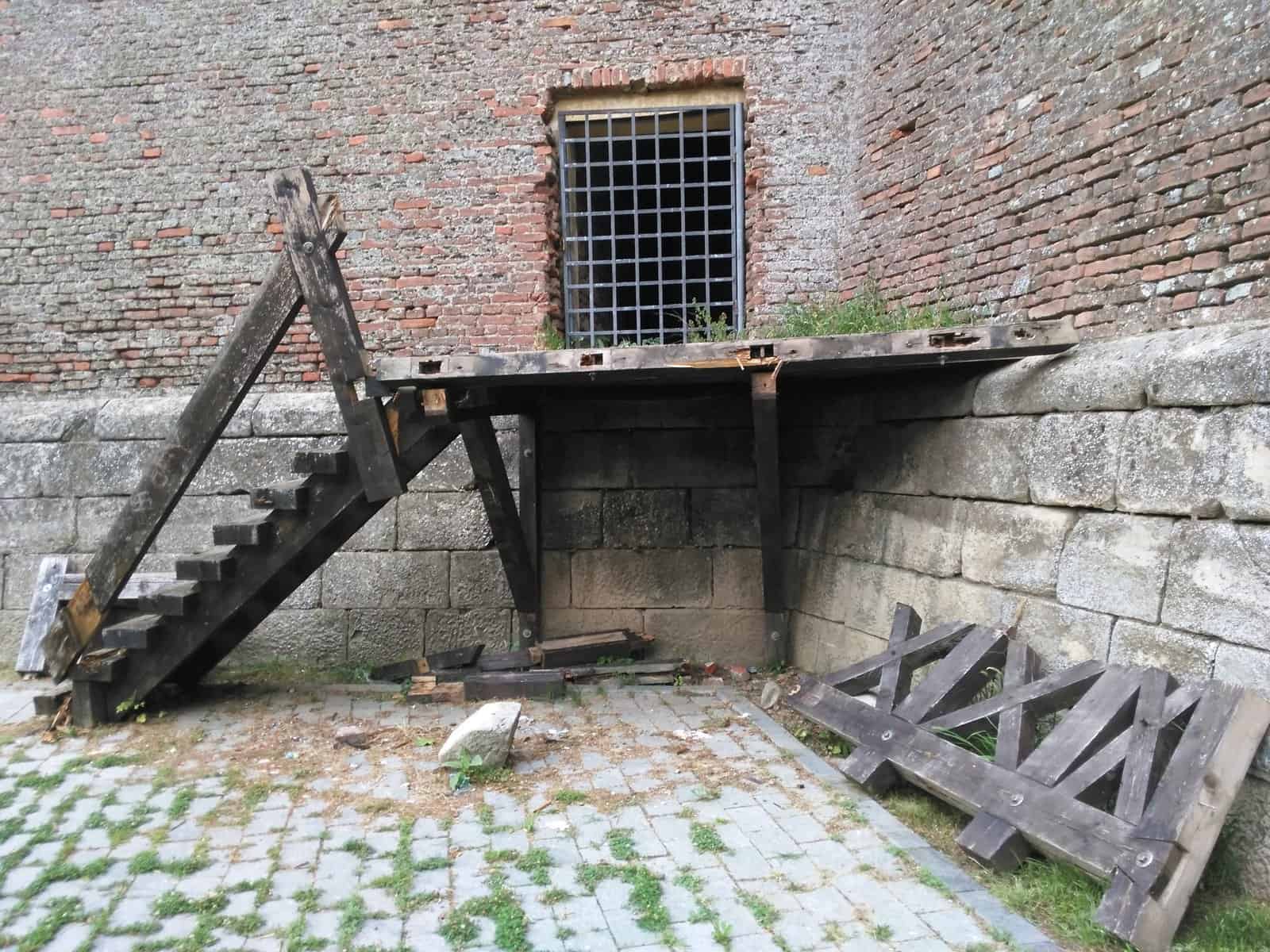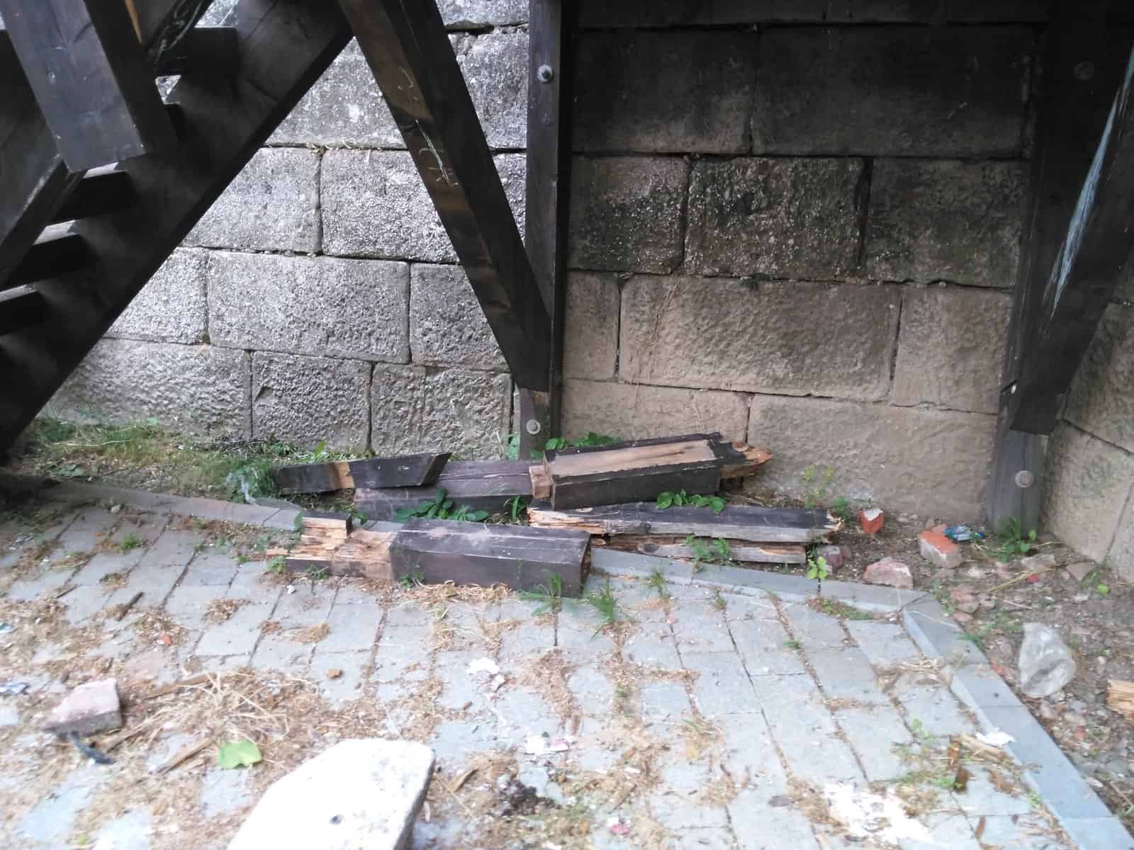 La numai câțiva metri, scările și podețul de acces la una dintre laturile cetății au fost și ele rupte și abandonate la fața locului. Lemnele din balustradă au fost adunate și așezate cu grijă lângă scări.