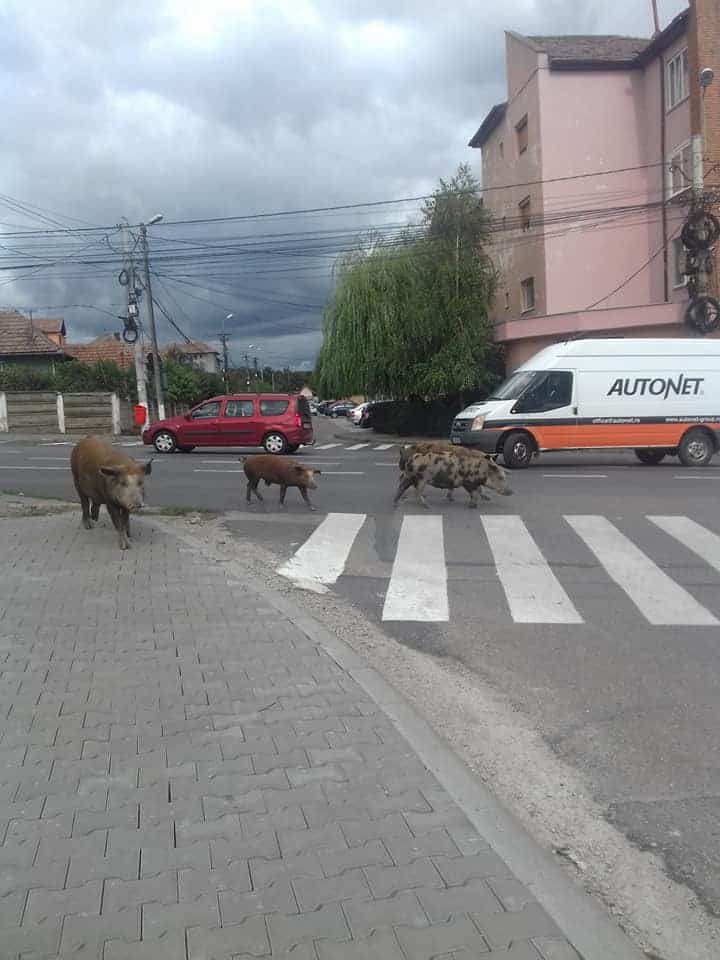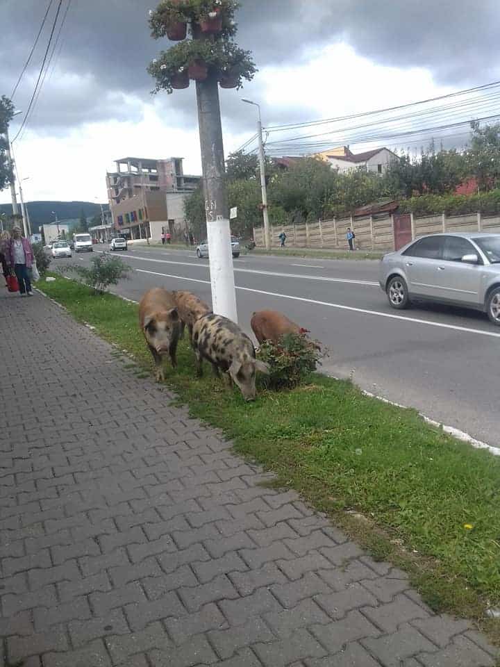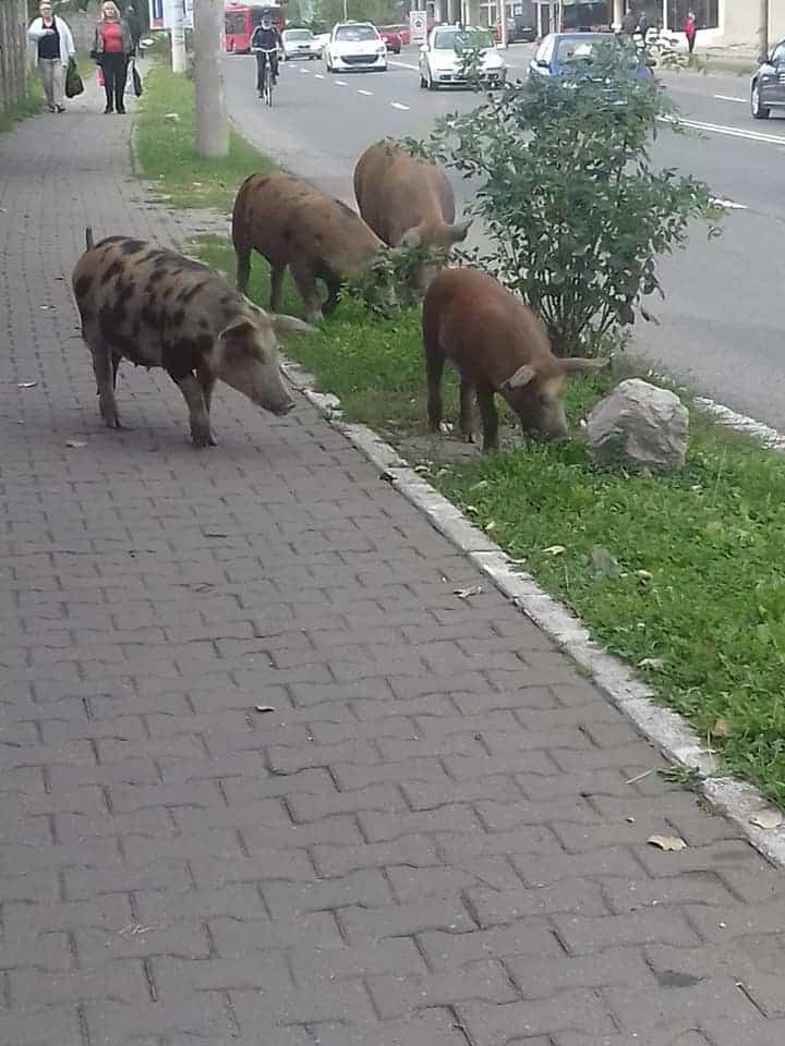 FOTO ŞTIREA TA pe Alba24: „Mascotele” orașului Alba Iulia au ieșit din nou la plimbare pe străzi. Porci surprinși în zona Bazinului Olimpic