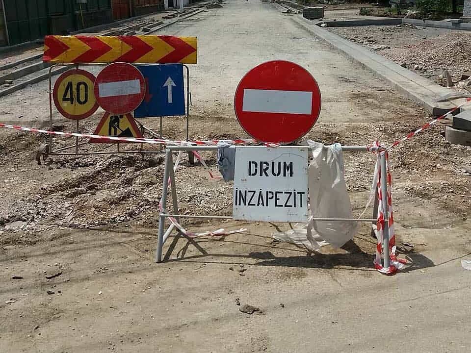 „Drum înzăpezit”, accesul interzis, în luna mai. O fi sau nu o glumă, un astfel de indicator a fost pus pe o stradă din Aiud unde se execută lucrări de asfaltare la un drum.