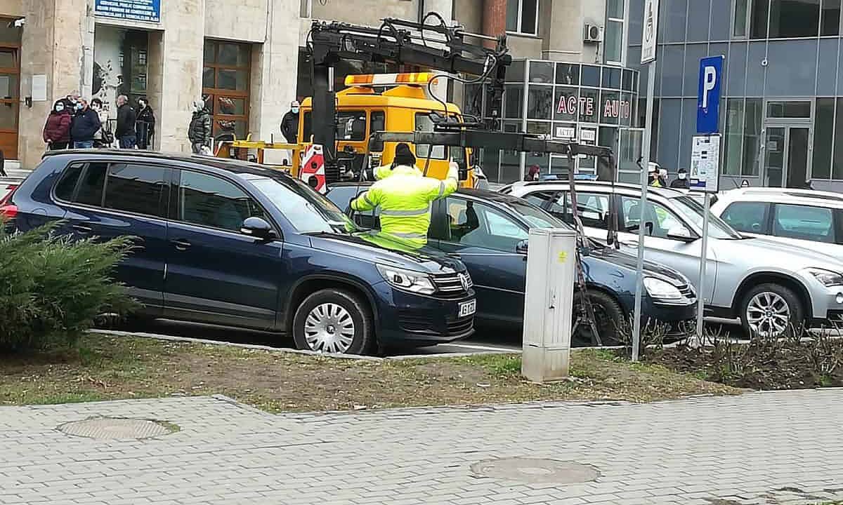 O mașină a fost ridicată din parcarea situată în fața sediului Serviciului de Evidență a Populației, de pe un loc marcat ca fiind destinat persoanelor cu nevoi speciale.