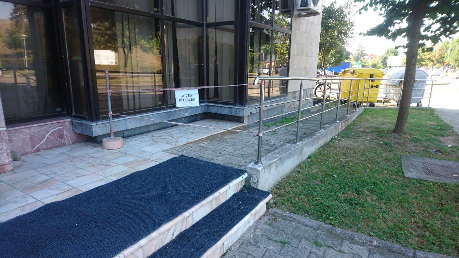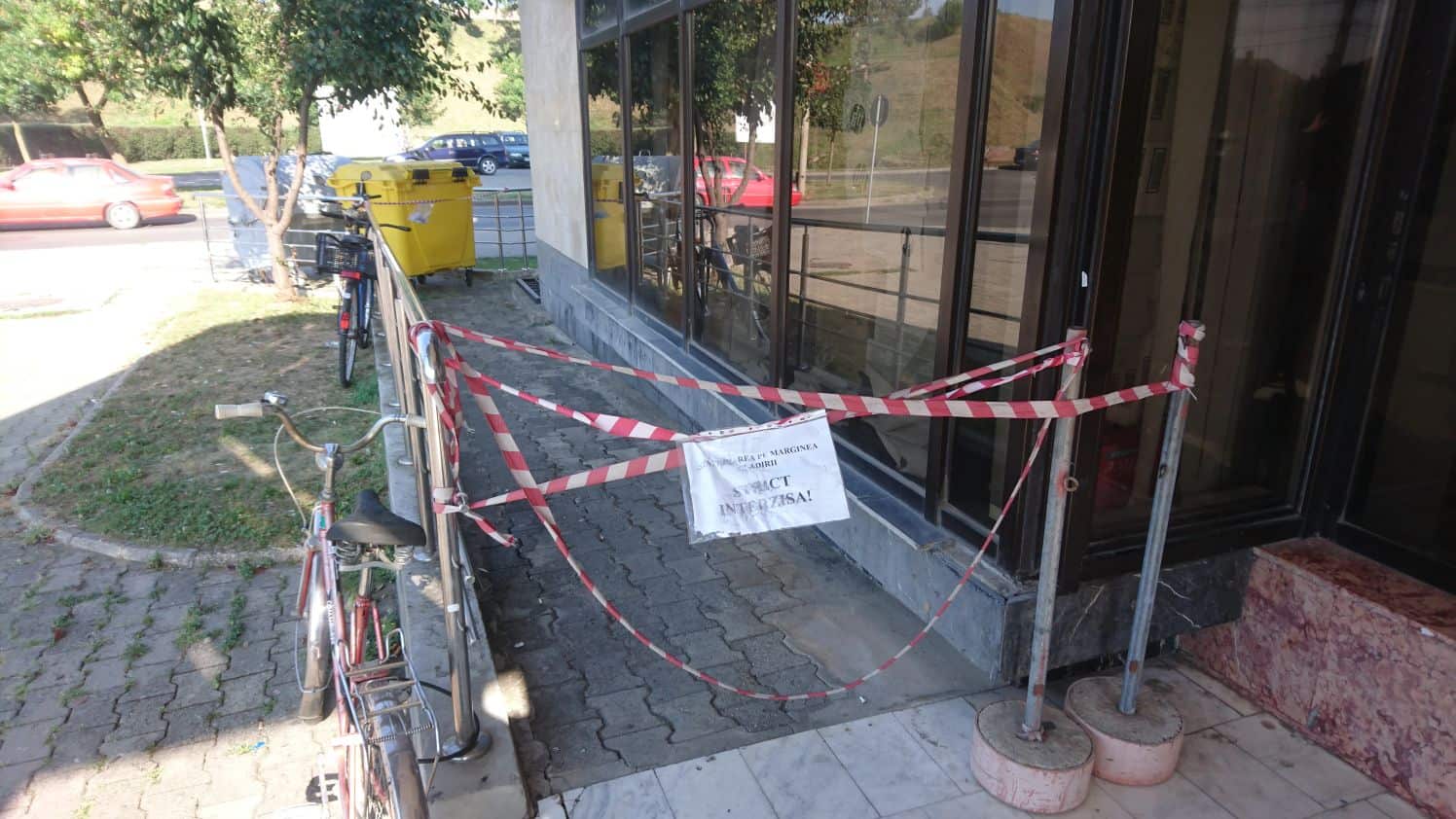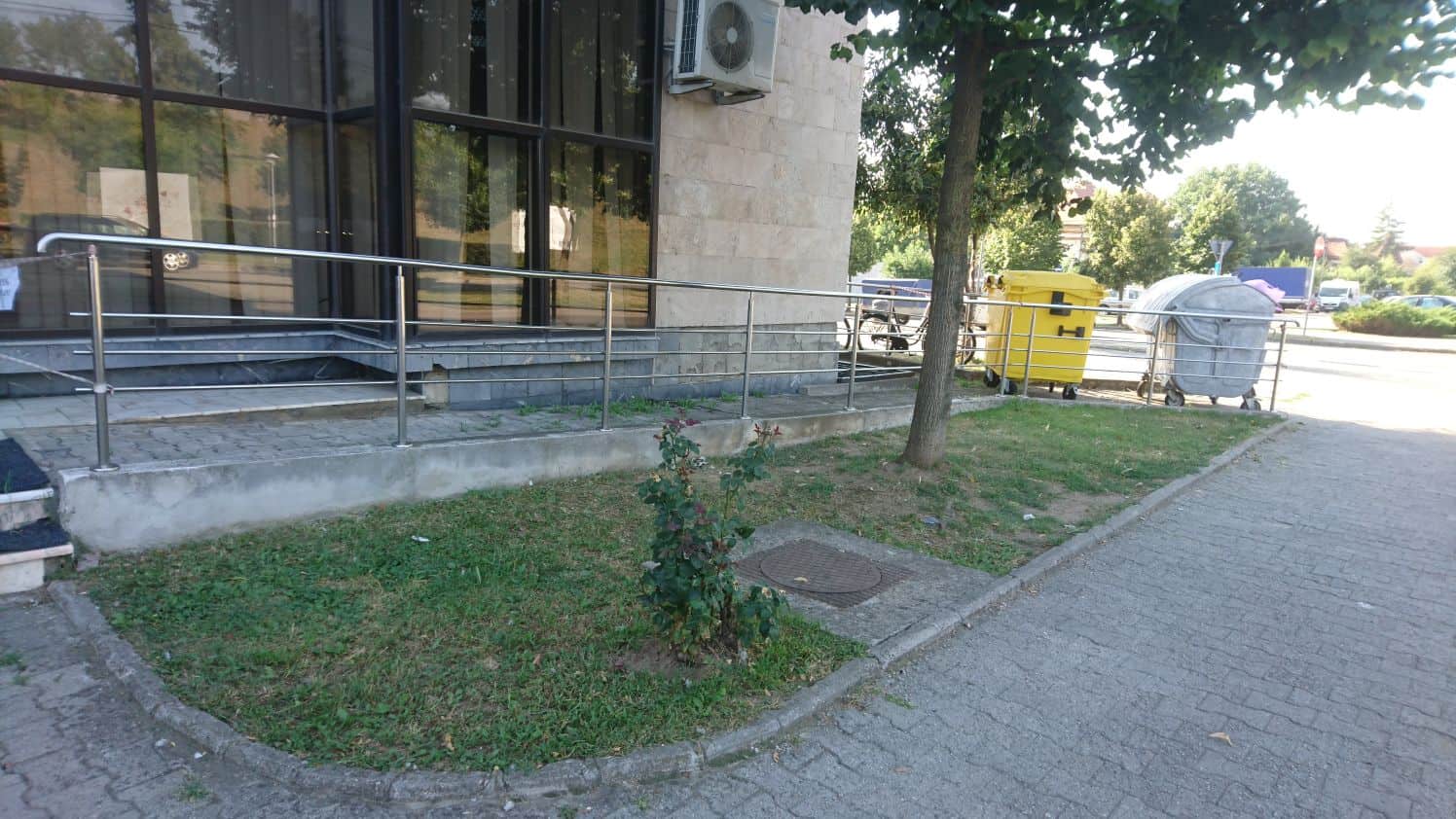 FOTO ȘTIREA TA: Rampele de acces în clădirea ”Electrica”, baricadate cu containere de gunoi. Interzis mamelor cu copii mici și persoanelor cu nevoi speciale