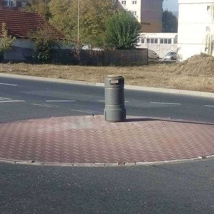 FOTO Știrea TA: S-a găsit „soluția” semnalizării sensului giratoriu din Ampoi 1. Un coș de gunoi ține loc de indicator