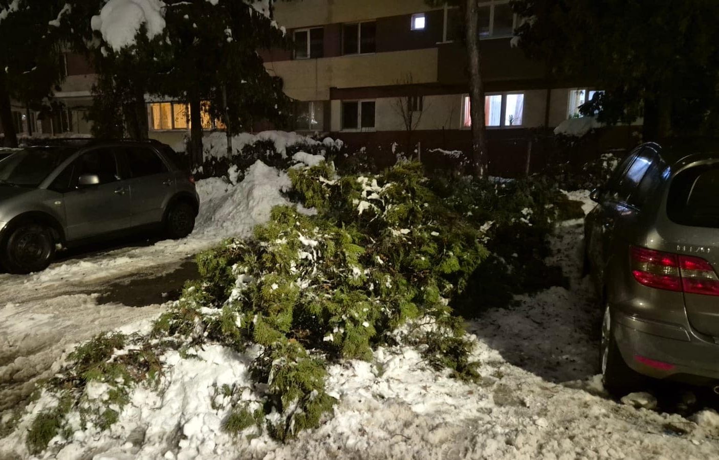 FOTO ȘTIREA TA: Un copac încărcat de zăpadă a căzut într-o parcare din Alba Iulia