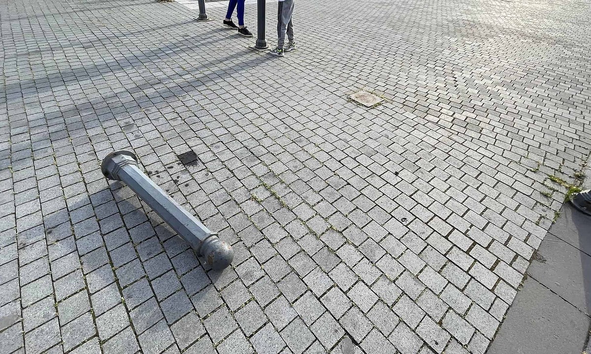 FOTO ȘTIREA TA: Un stâlp de metal din Piața Cetății din Alba Iulia, a căzut lângă picioarele unei fetițe. ”Niște iresponsabili!”