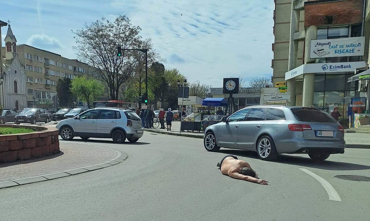 Un nou incident în care a fost implicat bărbatul cunoscut sub porecla ”Van Damme” s-a petrecut la Alba Iulia. Acesta a fost surprins în imagini, joi, în timp ce stătea întins pe carosabil, într-o zonă cu trafic aglomerat din municipiu, la orele amiezii.