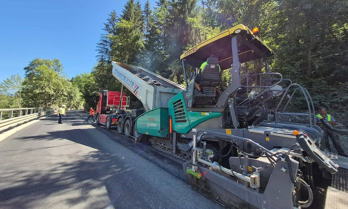 În prezent se toarnă stratul de uzură din mixtură asfaltică pe trei tronsoane afectate de calamitățile din 2021 – inundații și alunecări de teren.