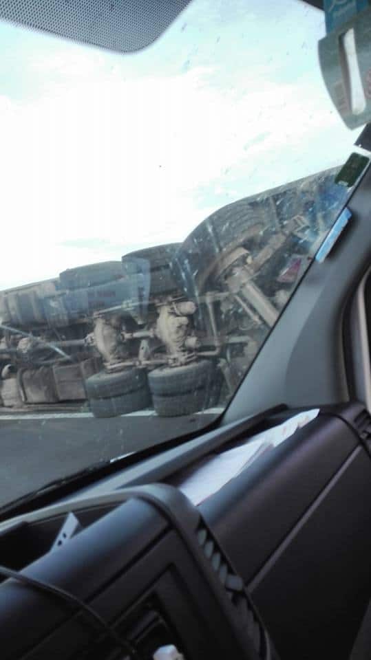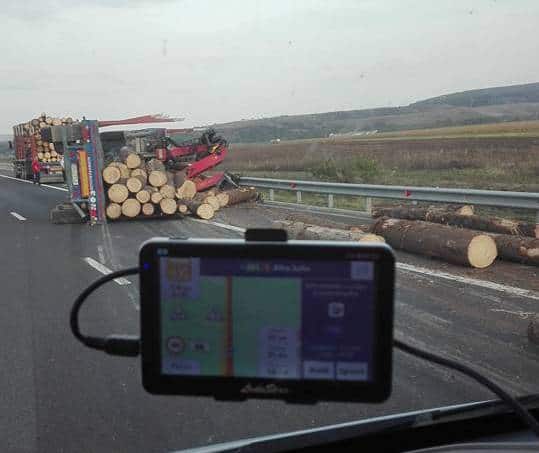 FOTO: Tir încărcat cu lemne, răsturnat pe autostrada Deva - Sibiu în apropiere de Sebeș. Se circulă pe o bandă