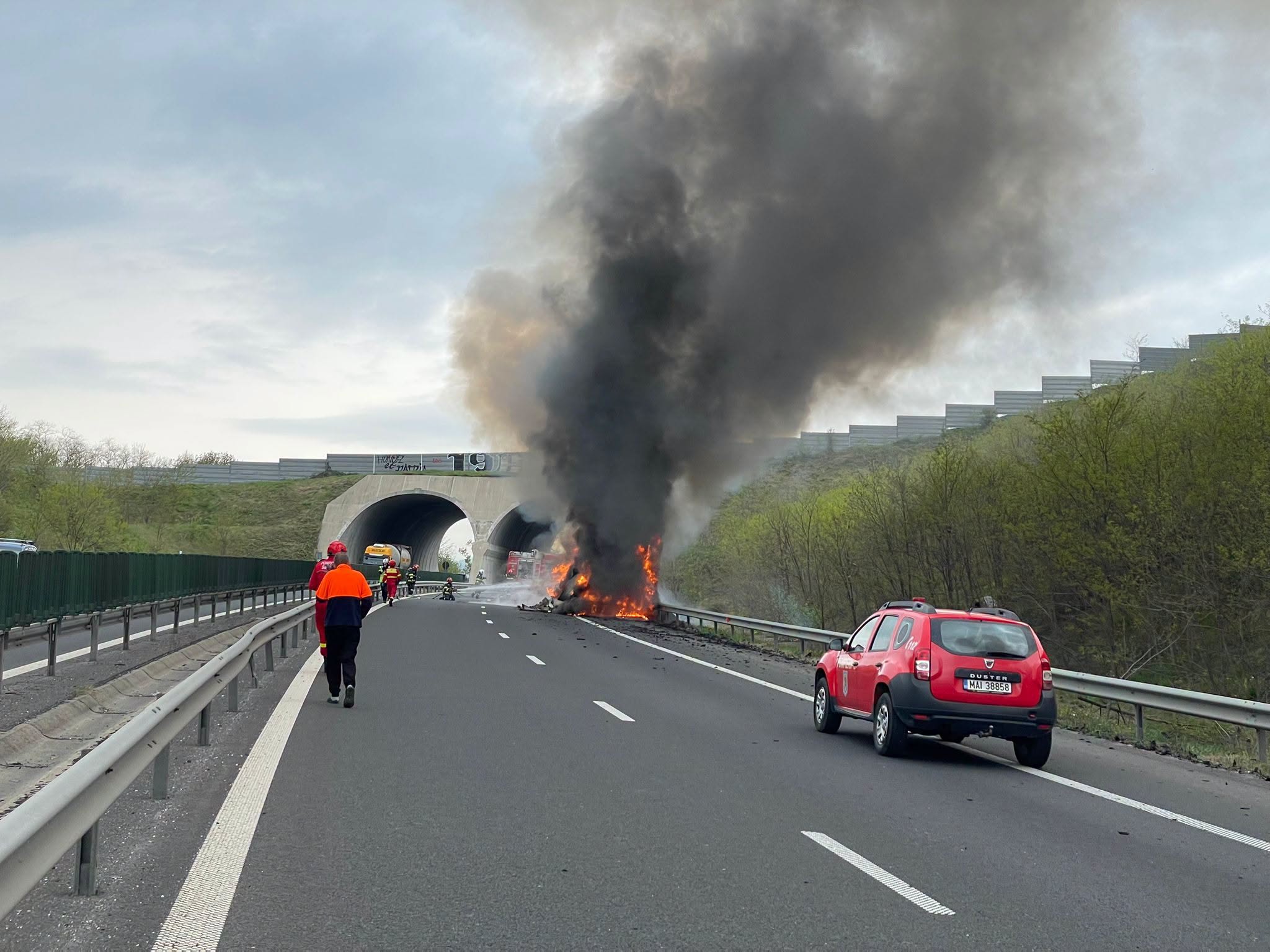 FOTO: Un autocamion a luat foc pe Autostrada A1, în Hunedoara. Trafic blocat temporar, pe sensul Deva - Timișoara