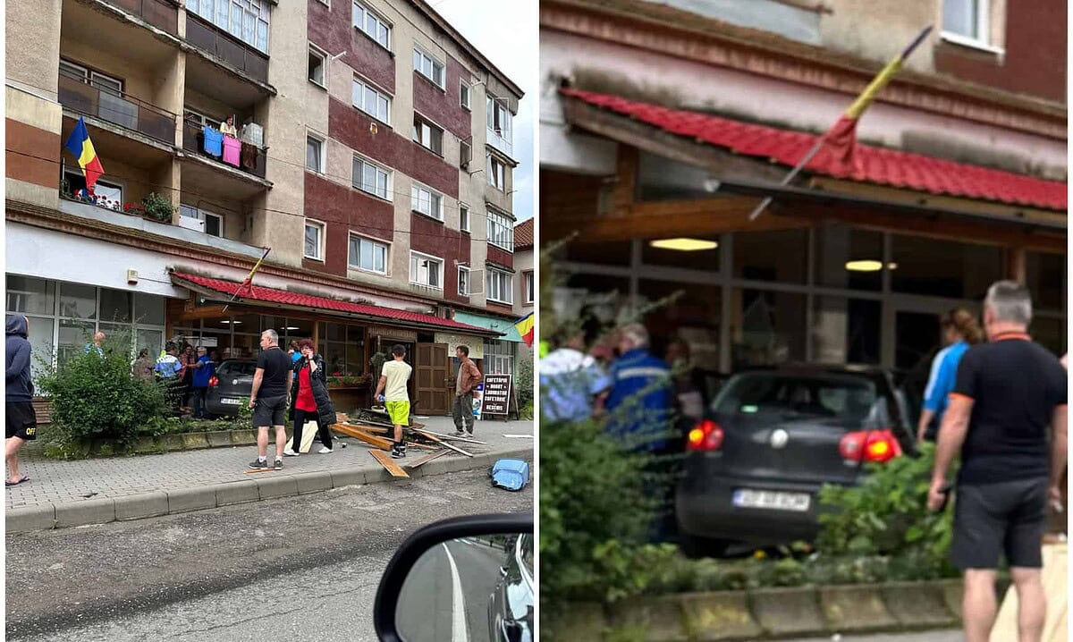 FOTO: Un autoturism a intrat într-o cofetărie, la Zlatna. Mașina, scăpată de sub control, a lovit terasa de la intrare