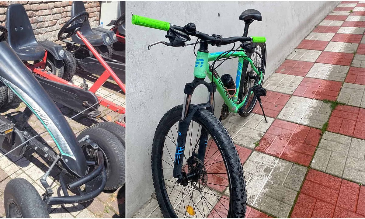 Este vorba despre un kart negru, de aproape doi metri și o bicicletă verde.