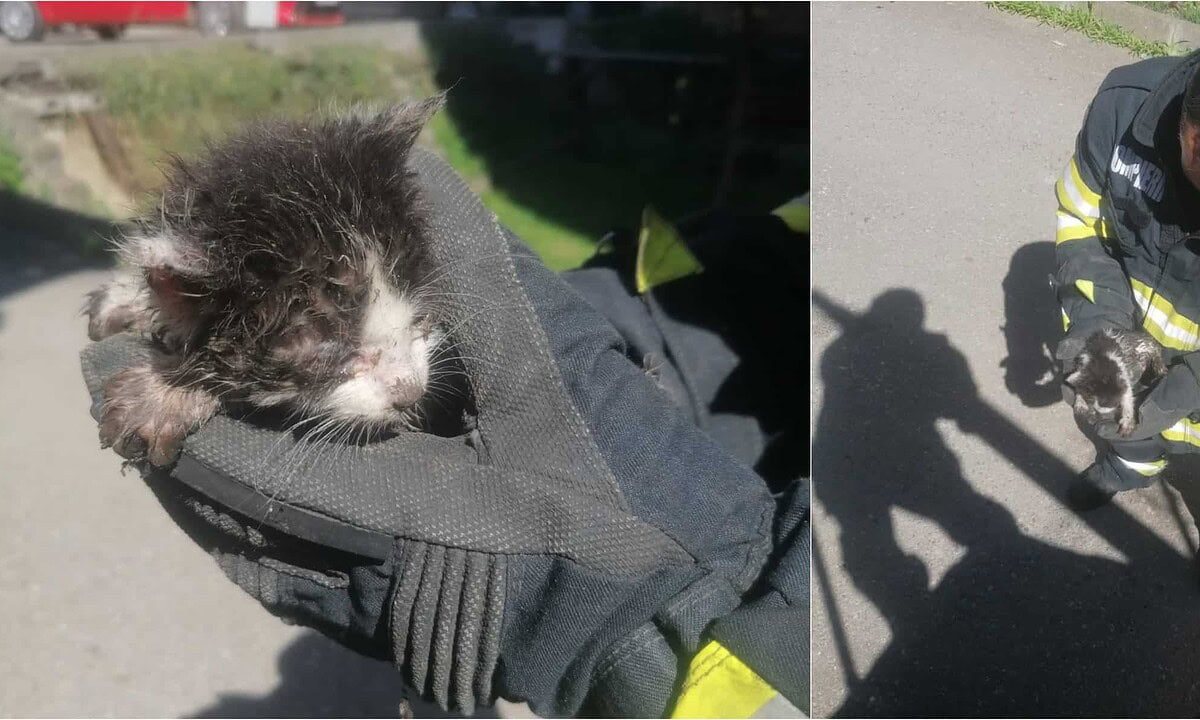 FOTO: Un pui de pisică, căzut într-un canal din Aiud, salvat de pompierii de la ISU Alba