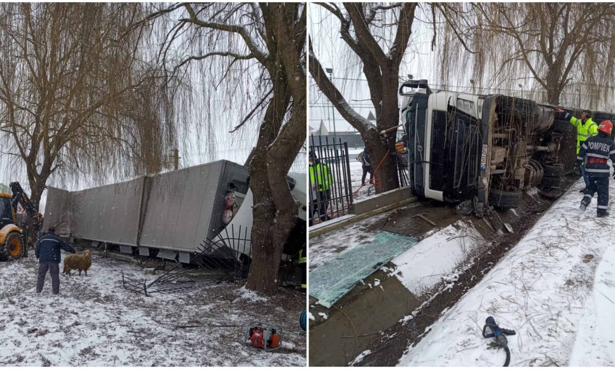 În urma impactului TIR-ul s-a răsturnat.