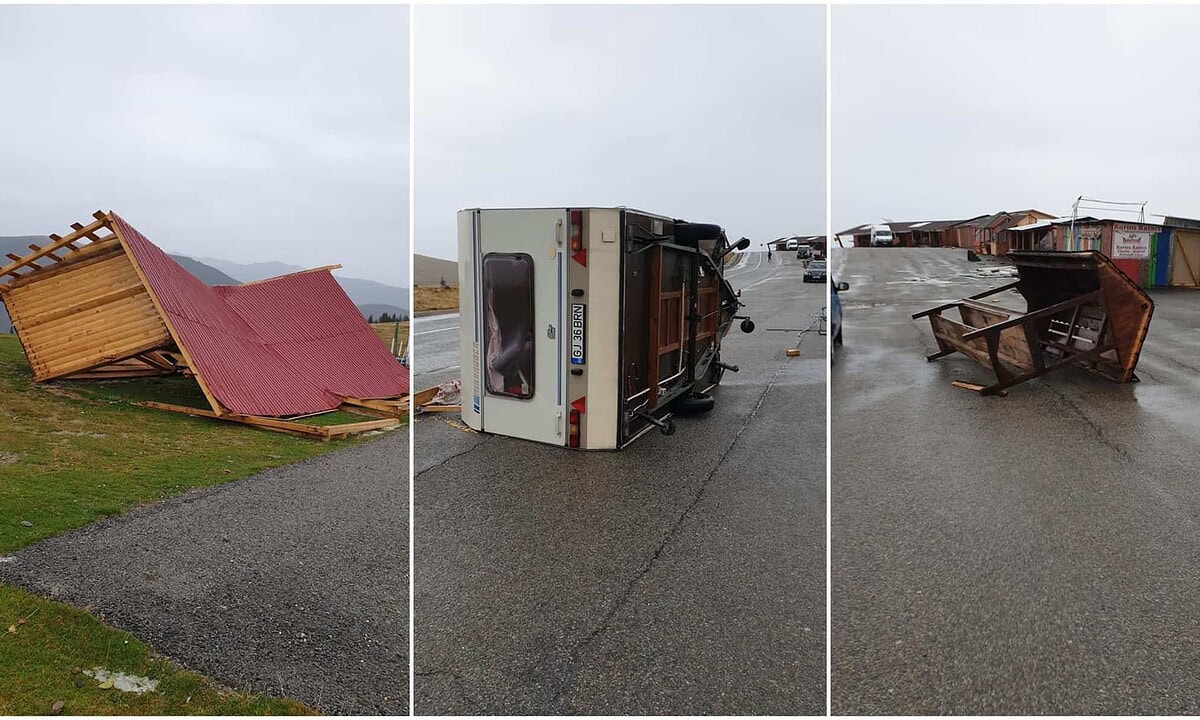 Pe acestea se poate observa mai multe tonete distruse sau avariate de vântul puternic, dar și o rulotă răsturnată. Acestea erau folosite pentru comercializarea de suveniruri şi alte produse specifice, la intrare în stațiunea Rânca dinspre Novaci.