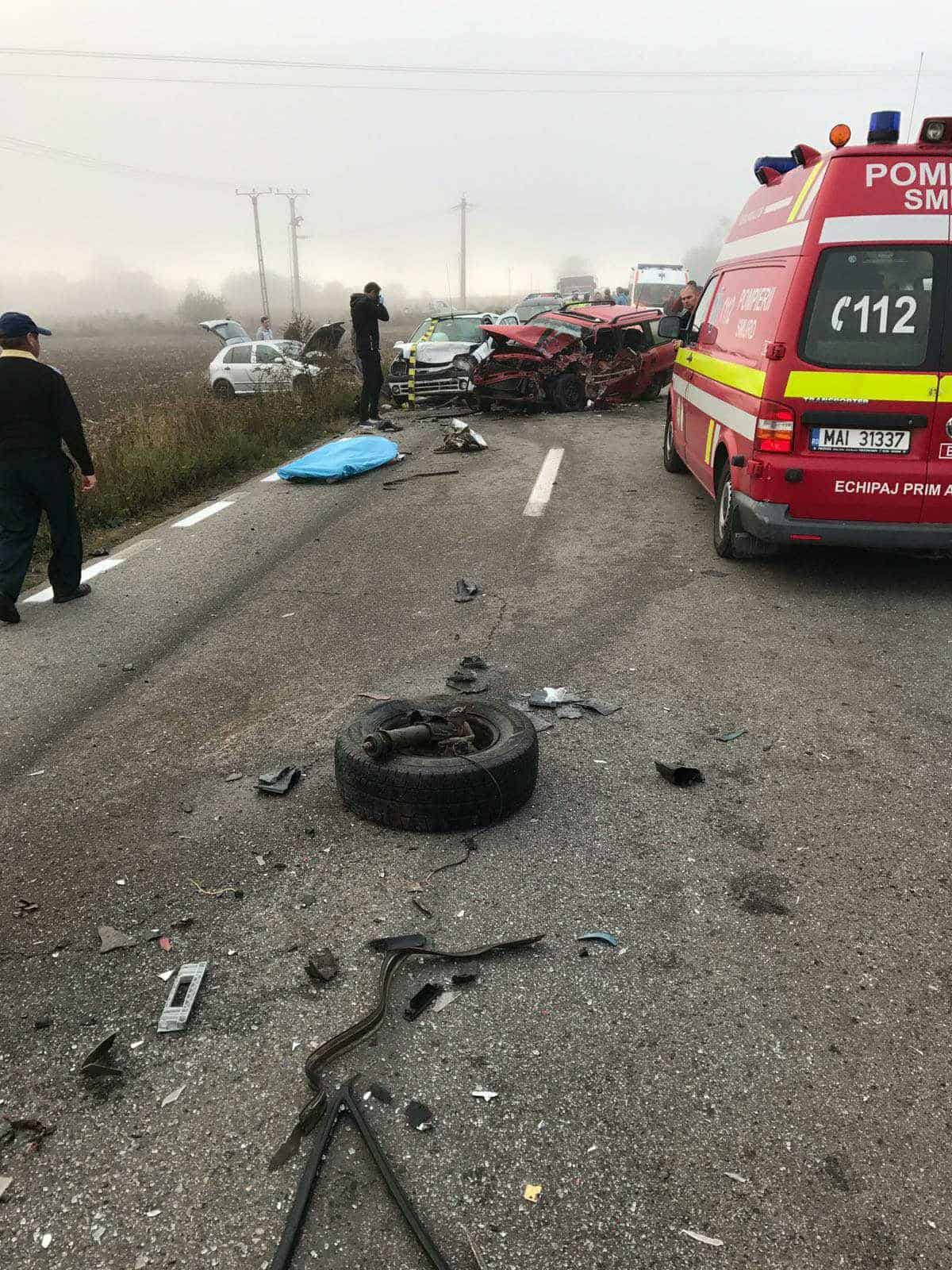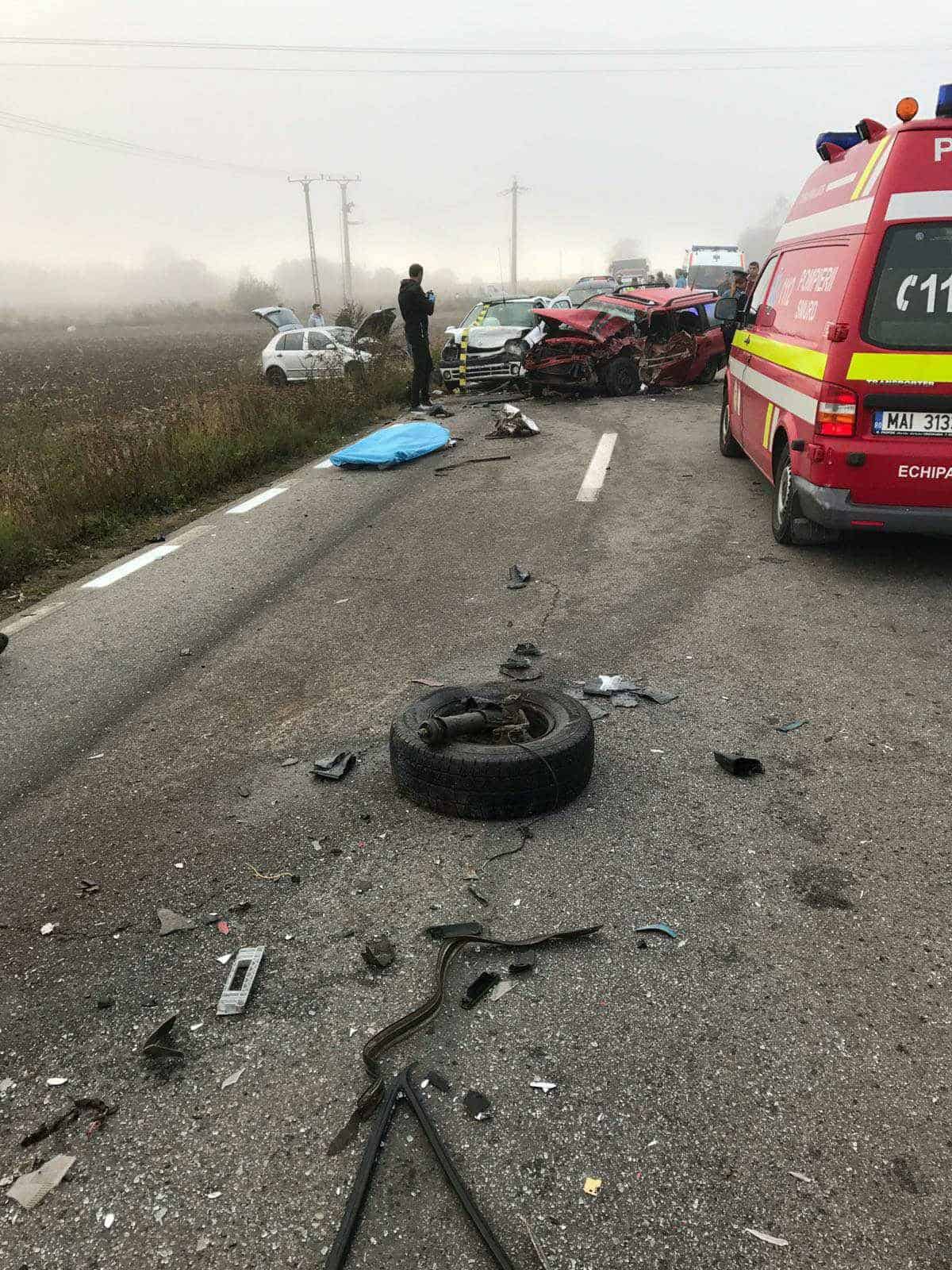 UPDATE: Din primele cercetări efectuate de poliţiştii deplasaţi la faţa locului a rezultat că un bărbat de 36 de ani, din comuna Vințu de Jos, judeţul Alba, în timp ce conducea un autoturism în direcția Șibot – Cugir, în condiţii de vizibilitate redusă, datorată ceţii dense, s-a angajat într-o depăşire, fără să se asigure în mod corespunzător, împrejurare în care a intrat în coliziune laterală cu autoturismul depăşit, care era condus de un tânăr de 26 de ani, din municipiul Topliţa, judeţul Harghita şi ulterior în coliziune frontală cu o autoutilitară, condusă, din sens opus, de un bărbat de 46 de ani, din Cugir.