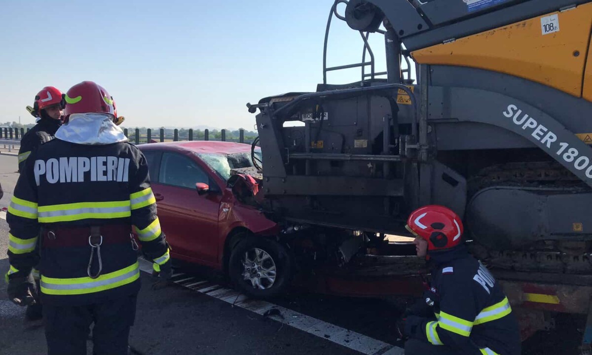 Un accident rutier s-a produs vineri dimineața, pe Autostrada A10 Sebeș-Turda, în zona municipiului Alba Iulia. O mașină a intrat într-un utilaj pentru turnat asfalt.