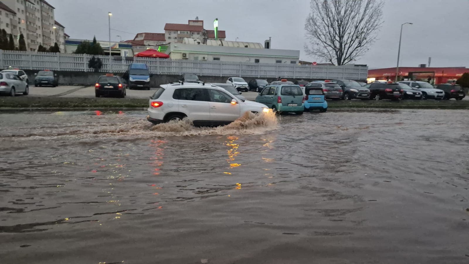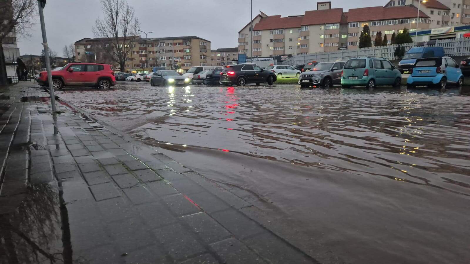 Apa a inundat parcarea din fața Stadionului Unirea și a ajuns și în incinta stadionului.