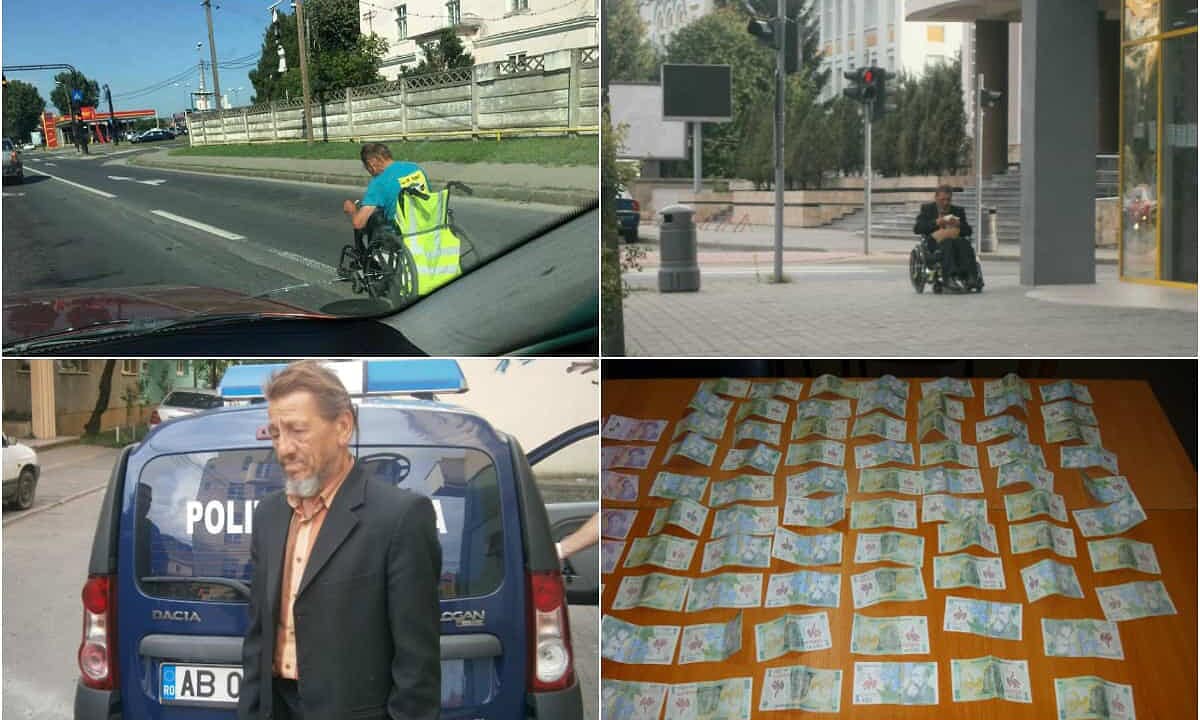 FOTO-VIDEO: "Cerșetor-impostor", amendat de polițiștii locali din Alba Iulia. Apela la mila publică, în scaun cu rotile, pe mijlocul drumului, într-o intersecţie aglomerată