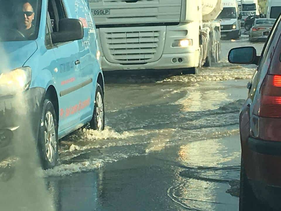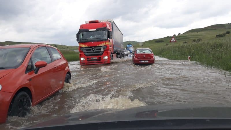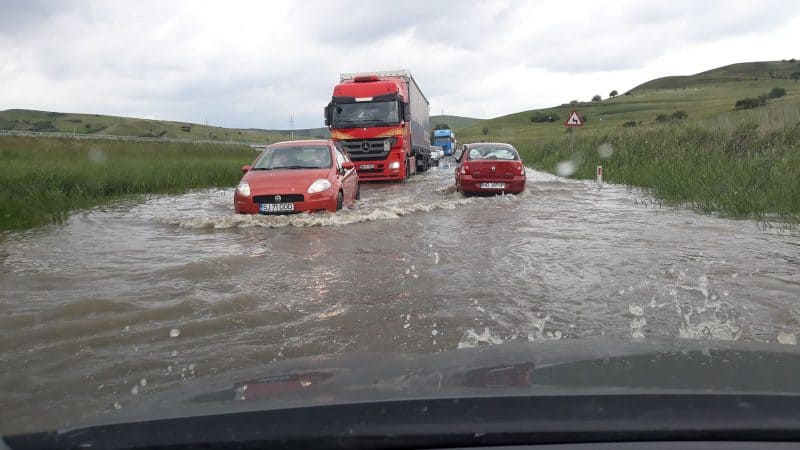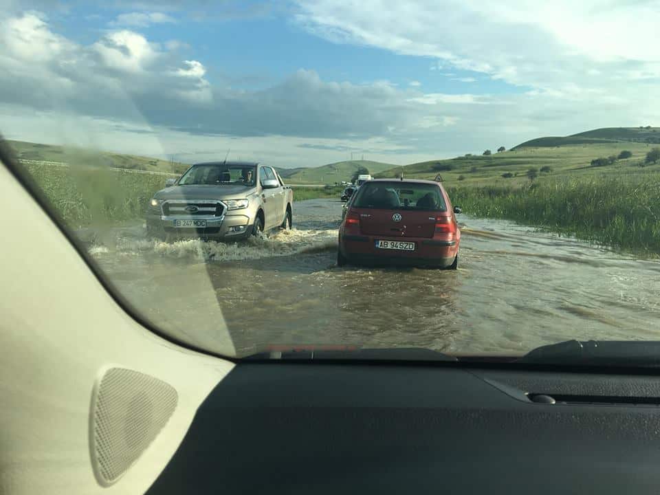 Șoferii aflați în trafic în zonă au surprins porțiunea de drum inundată și au postat imaginile pe rețeaua de socializare Facebook.