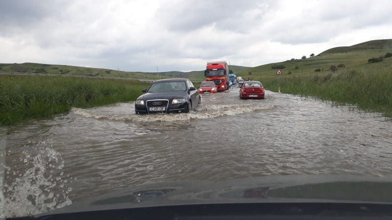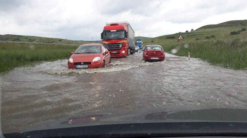 FOTO-VIDEO: Circulație rutieră îngreunată pe DN1, între Unirea și Turda. Drum inundat, în zona localității Stejeriș