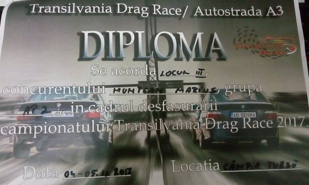 Albaiulianul Dorian Ignat (32 de ani) s-a clasat pe locul I la categoria "Street", grupa S3. A parcurs distanţa de 402 metri în 13.4 secunde (165 km/h), cu un BMW E36 de 270 CP. Are experienţă în astfel de competiţii, având în palmares mai multe titluri.