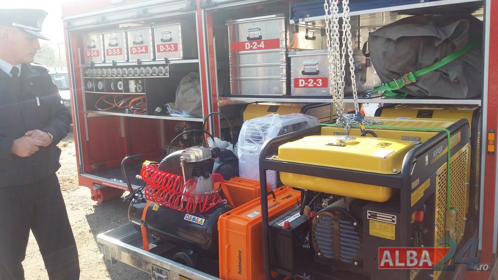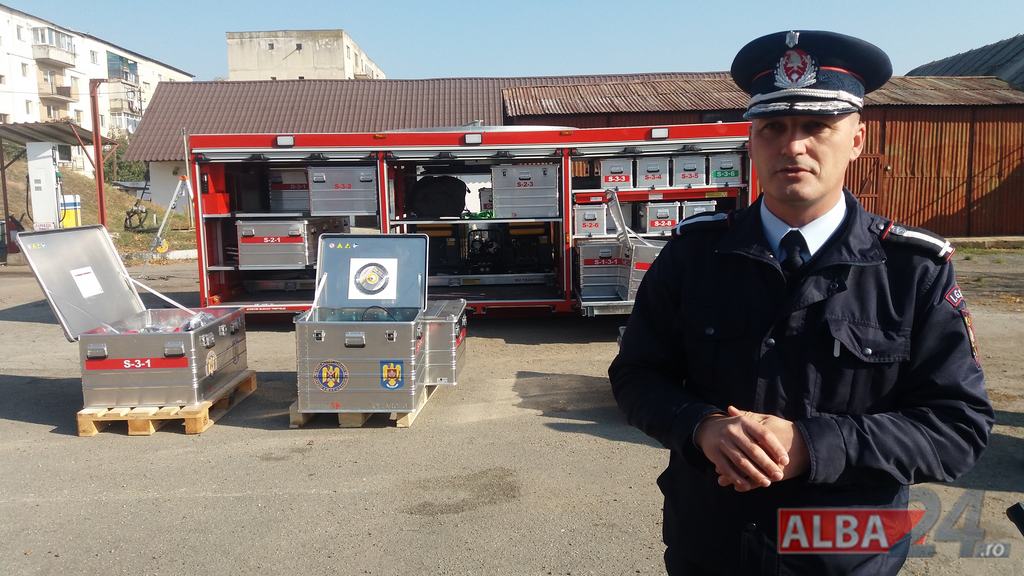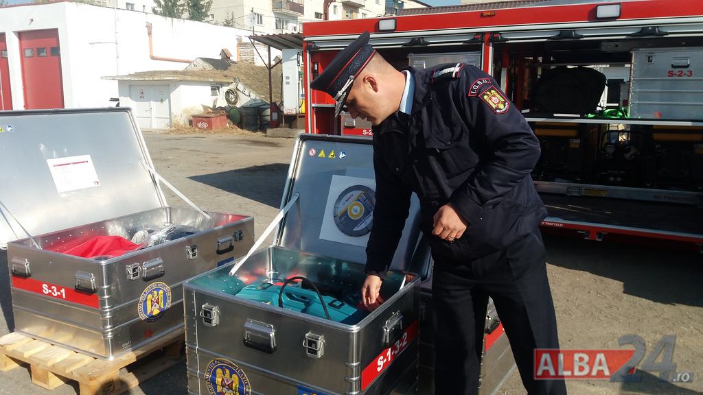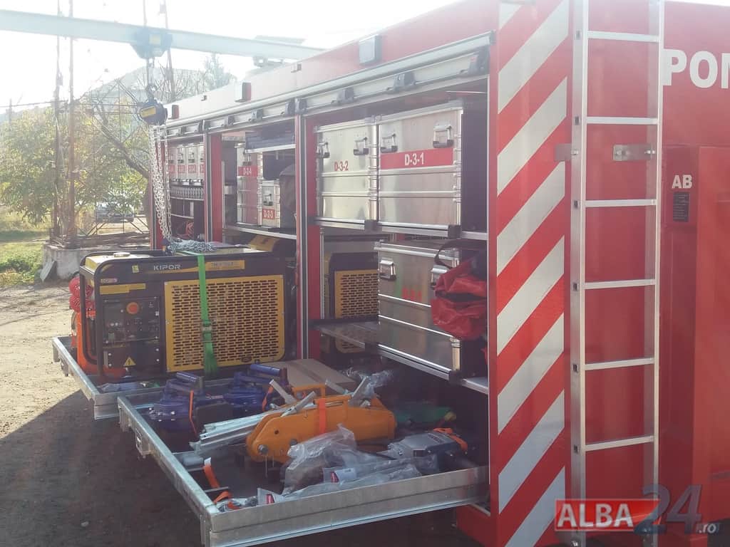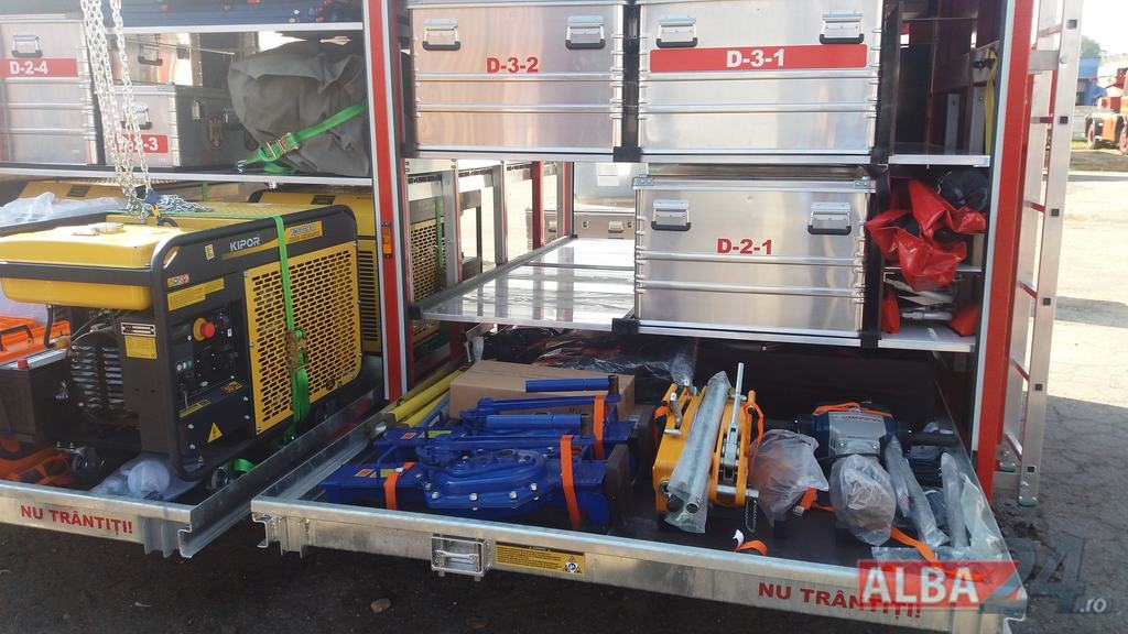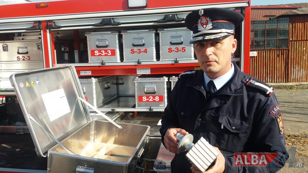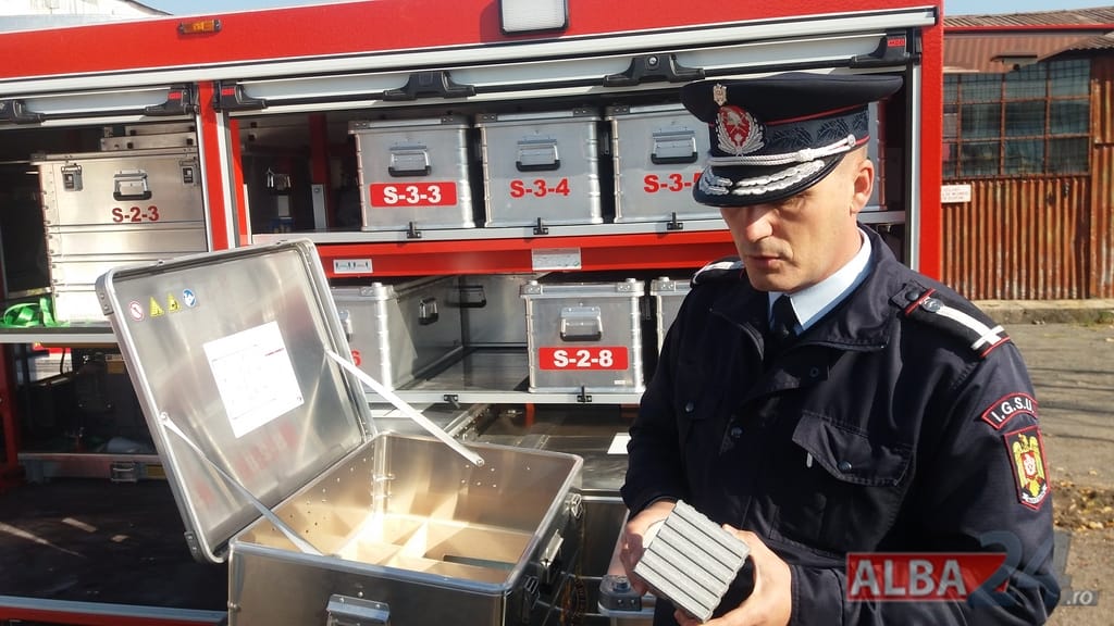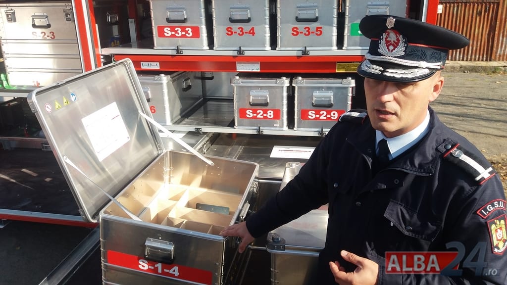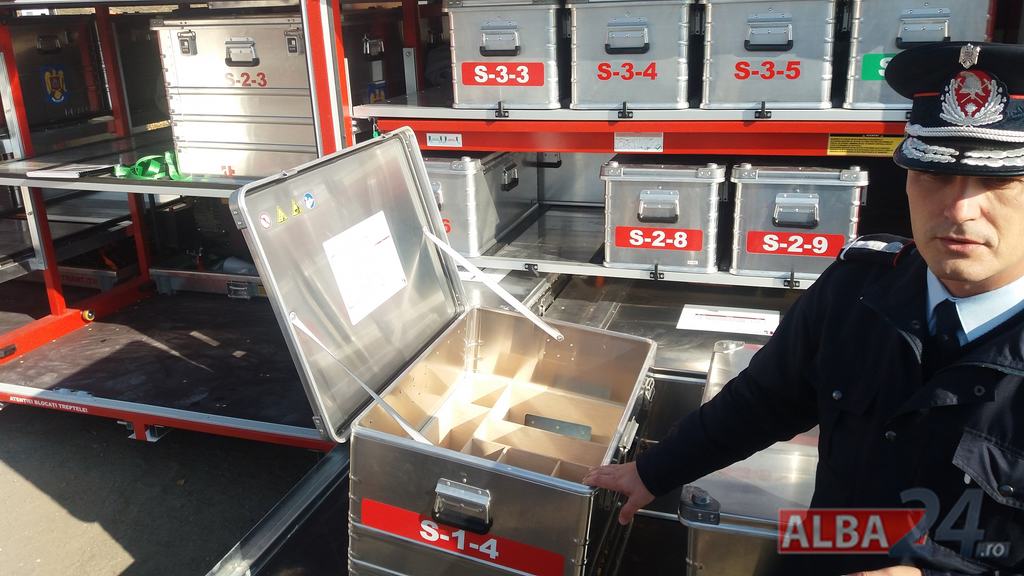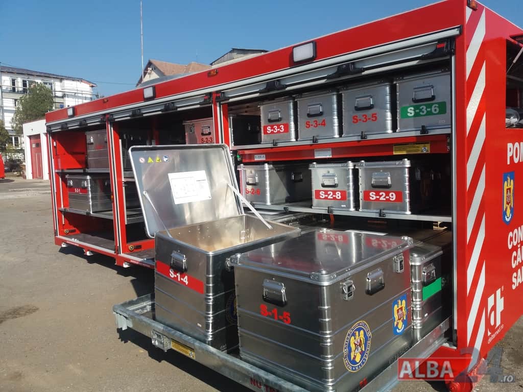 "Conținutul exact al containerului este personalizabil după nevoile punctuale ale fiecărui beneficiar, dar în principiu ele transportă cât mai multe din tipurile de echipamente specifice operațiunilor de căutare-salvare, dar și PSI: echipamente pentru ridicare; pentru iluminat; de descarcerare; de geniu; pneumatice; de tâmplarie; salvare de la înălțime; pentru detecția curentului electric; pentru căutare de victime rămase captive, în urma unor cutremure, alunecări de teren, avalanșe; echipament de protecție pentru salvatori, inclusiv PSI; materiale de construcție; echipamente PSI. Deși avem de-a face cu un volum mare de echipamente, accesul la ele se face rapid, mulțumită unei compartimentări ergonomice", precizează reprezentanţii ISU Alba.