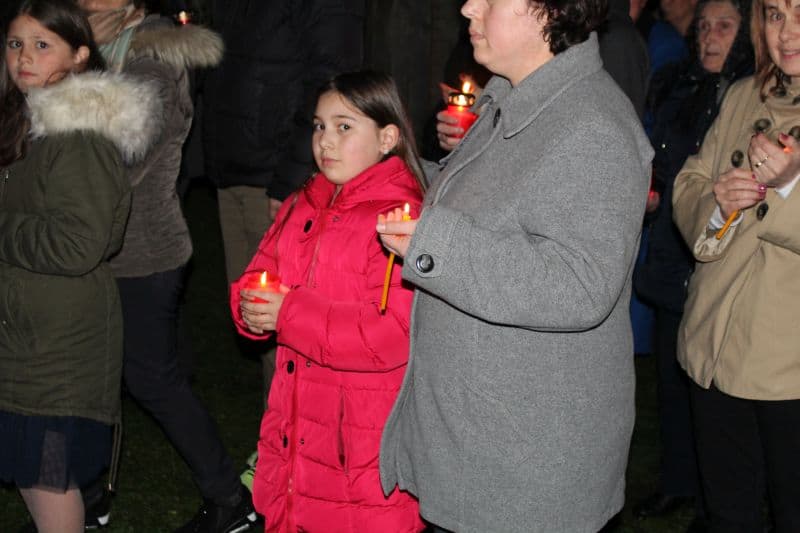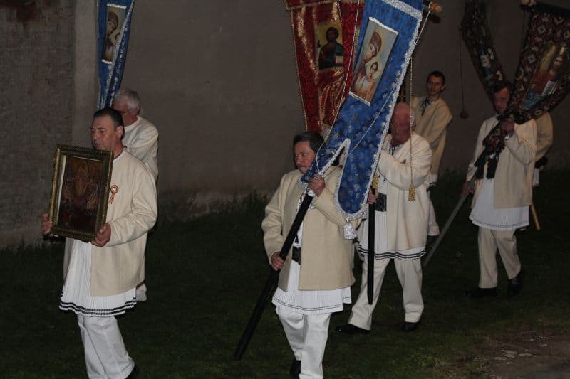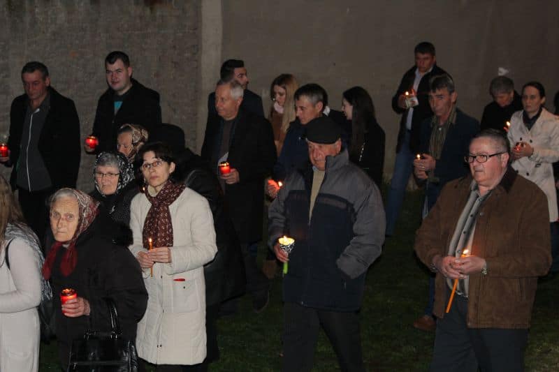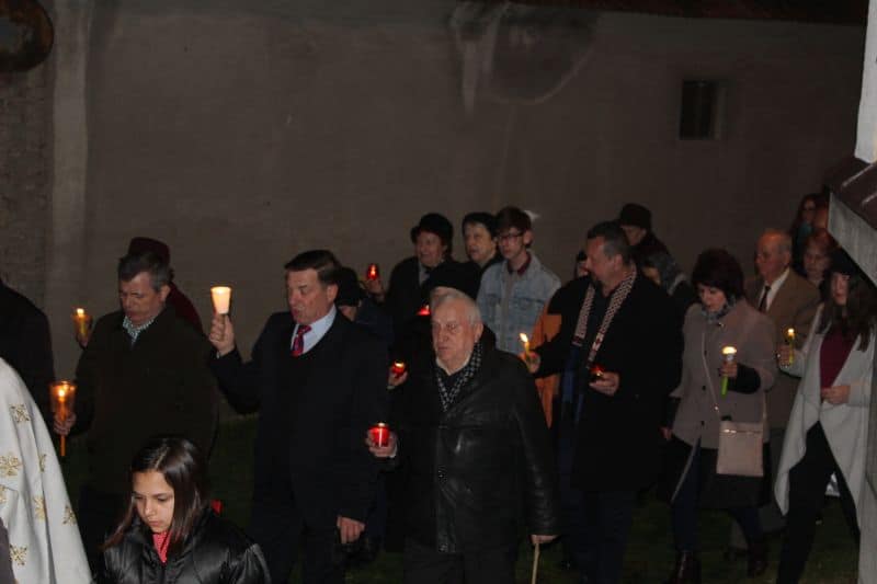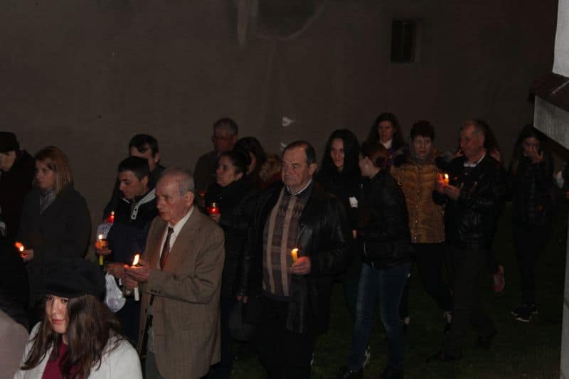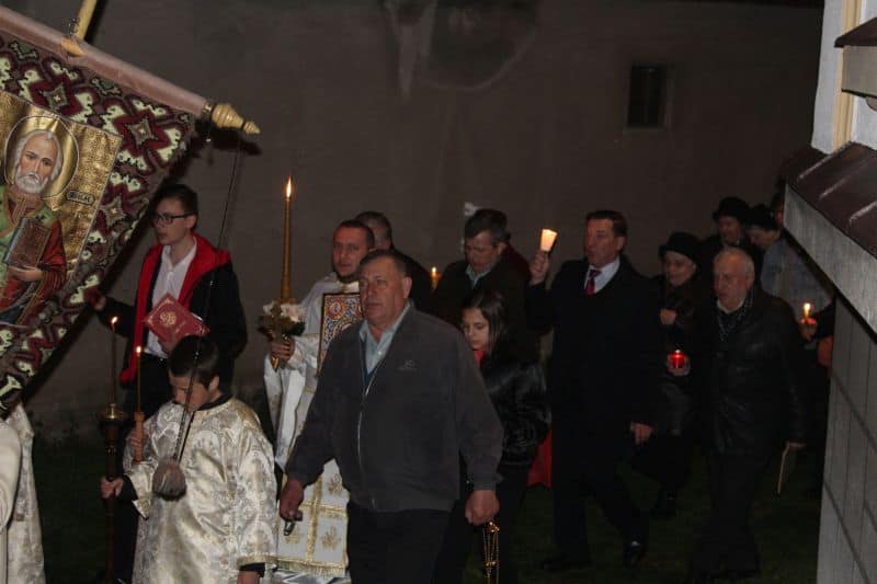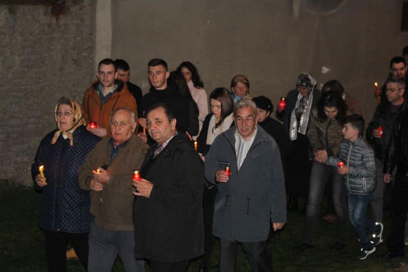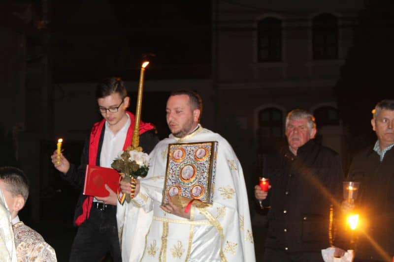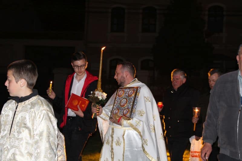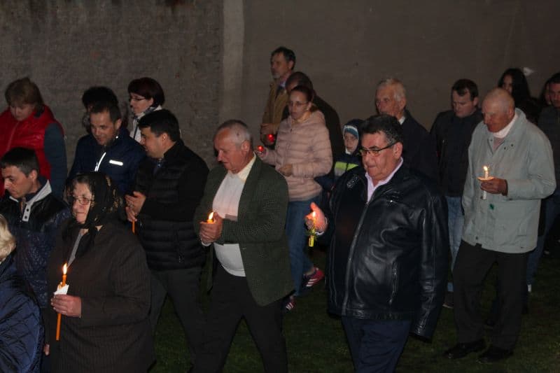 La ora 12.00, preoții au ieșit din biserică având lumânarea aprinsă cu Lumina Sfântă, și i –au îndemnat pe cei prezenți cu tradiționalele cuvinte : "Veniți de luați Lumină!". După ce lumânările celor prezenți s-au aprins , alaiul având în frunte paștenii urmați de preoți alături de credincioși , au înconjurat biserica de trei ori, cântând : "Hristos a Înviat din morți, cu moartea pe moarte câlcând, și celor din morminte viață dăruindu-le".