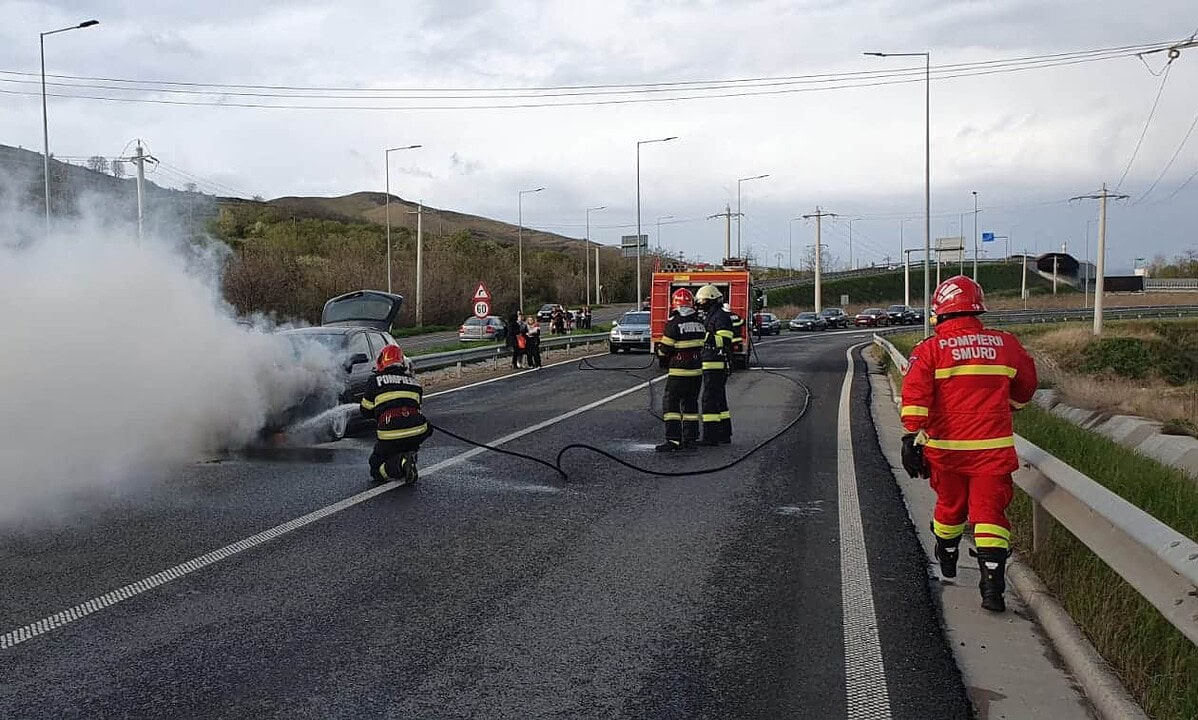 UPDATE, ora 18.54: În autoturism se aflau trei persoane care, până la ajungerea forțelor de intervenție la locul solicitării, s-au autoevacuat. Incendiul a fost stins.