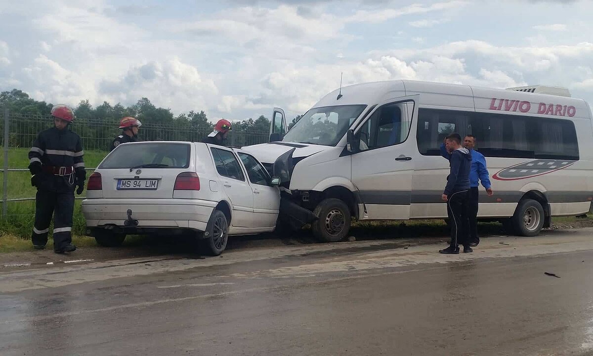 UPDATE: Şoferul unui autoturismului ar fi pierdut controlul volanului, din cauza drumului umed, a intrat pe contrasens şi a lovit microbuzul care circula regulamentar.