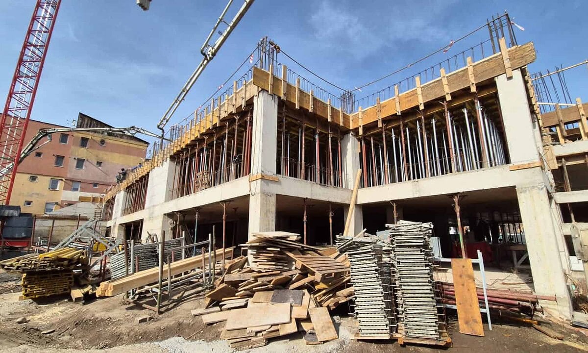 Constructorii au reușit joi să toarne betonul la planșeul peste etajul 1, utilizând aproximativ 200 mc de beton. De asemenea, au fost realizate compartimentările interioare la nivelul parterului.