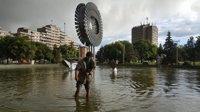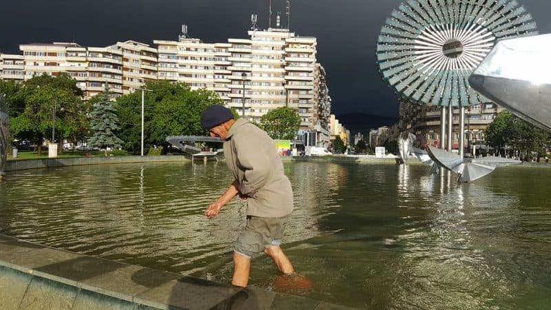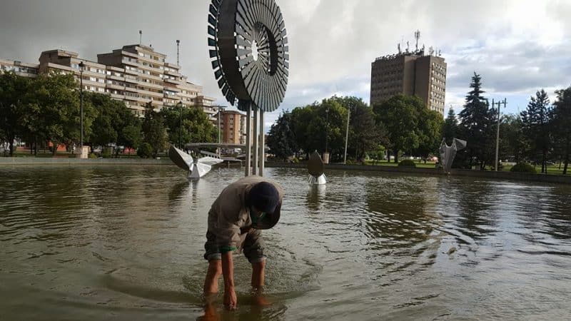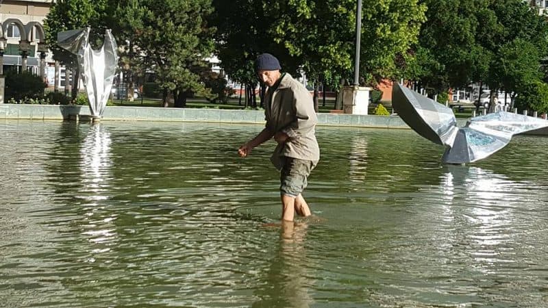 Dis de dimineață cu pantalonii suflecați până peste genunchi, un bărbat din Sebeș pe nume Nicu după spusele trecătorilor, s-a apucat de căutat bănuți prin fântâna arteziană din Parcul Unirii.