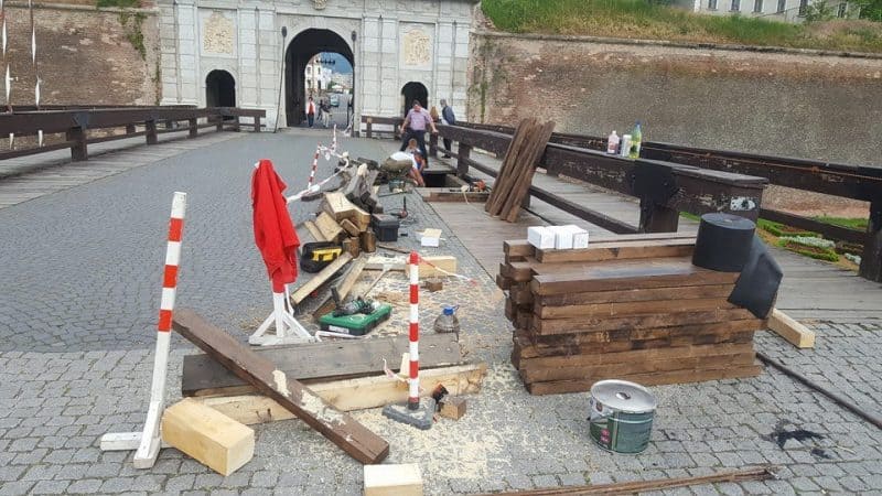 Lucrări de reparații la Poarta a III-a a Cetății Alba Carolina. Podul de lemn a cedat sub roțile unei mașini rătăcite.