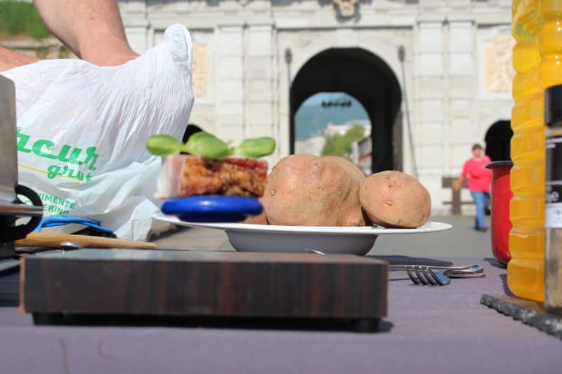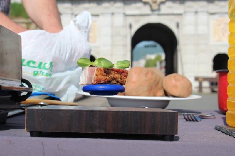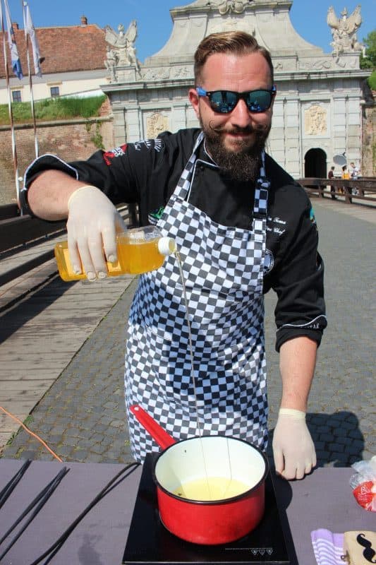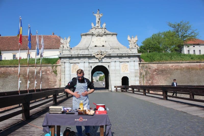Chef Cosmin Toma continuă să promoveze oraşul Alba Iulia şi Cetatea Alba Carolina prin demonstraţii culinare în spaţiul istoric. Joi, acesta a pregătit un preparat tradiţional din Munții Apuseni, merinde, adică chifteluțe de cartofi cu ciuperci sălbatice.