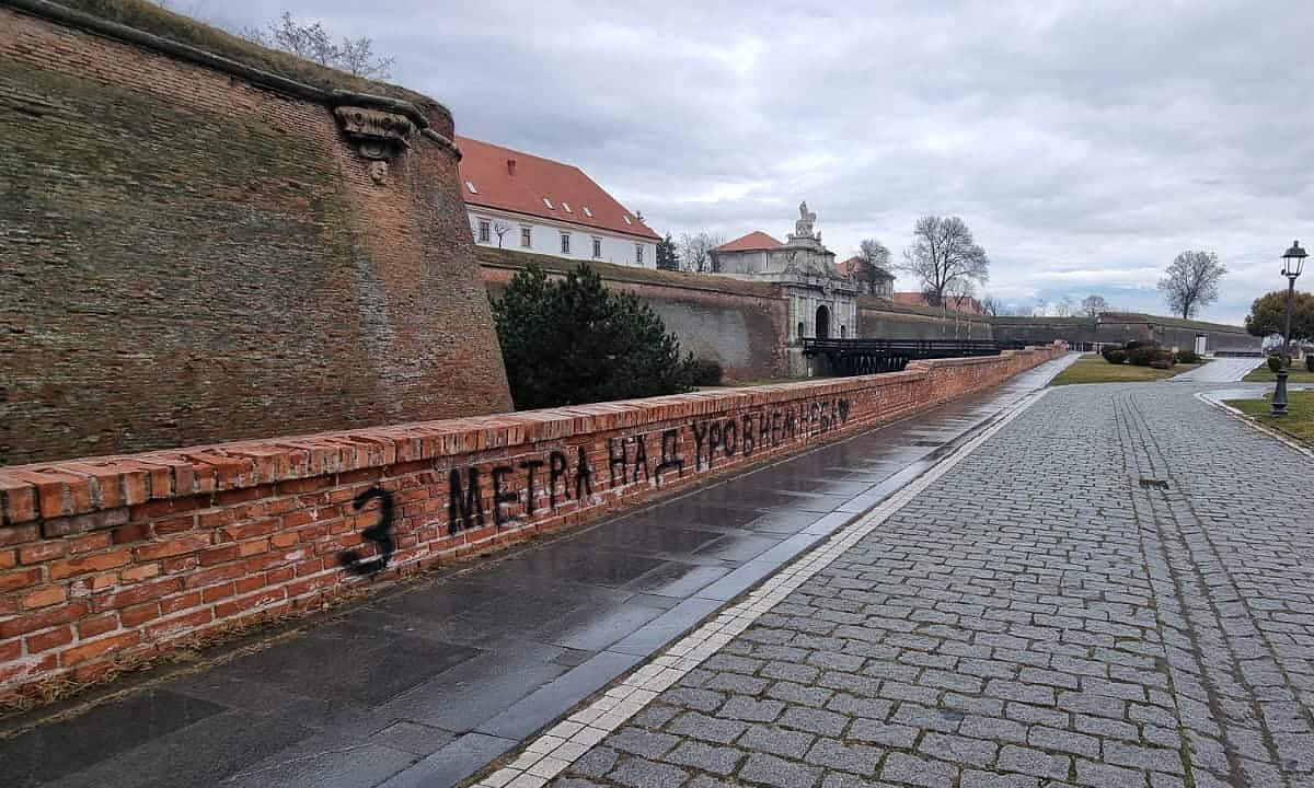 FOTO: Zidurile Cetății Alba Carolina, din Alba Iulia au fost vandalizate cu inscripții în alfabet chirilic. Situația a fost semnalată de viceprimarul orașului, Emil Popescu.