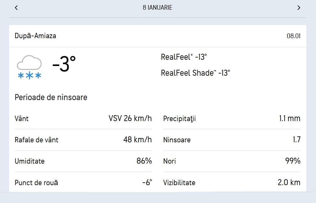 La Blaj vor fi - 3 grade joi după-amiază, dar, potrivit aplicațiilor meteo, temperatura resimțită va fi mult mai scăzută: - 13 grade Celsius.