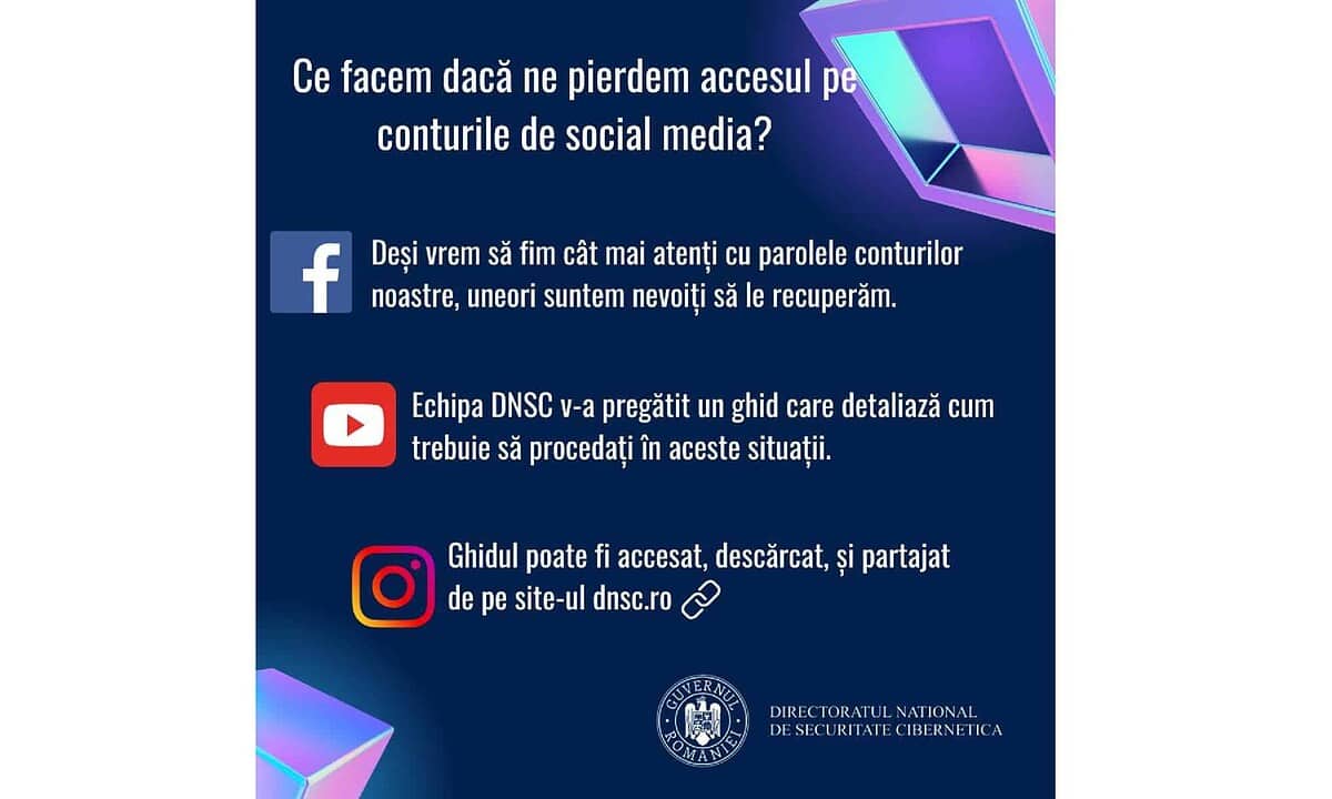 „Ţi-ai pierdut accesul la contul de social media şi nu ştii ce paşi trebuie să urmezi pentru recuperarea lui? Echipa DNSC ţi-a pregătit un ghid extrem de util pentru protejarea şi recuperarea conturilor social media - Facebook, Instagram, Twitter, WhatsApp, TikTok şi Youtube”, a transmis DNSC, într-o postare pe Facebook.