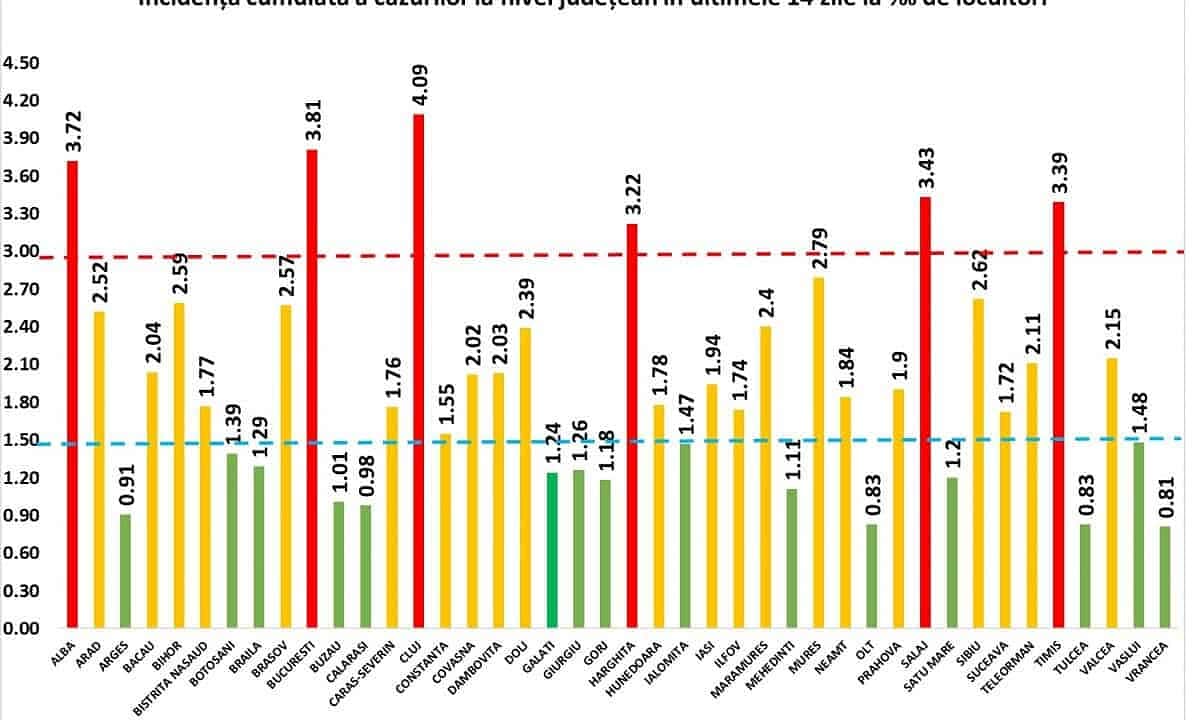 Județele cu incidență de peste 3 la mia de locuitori în ultimele 14 zile sunt: