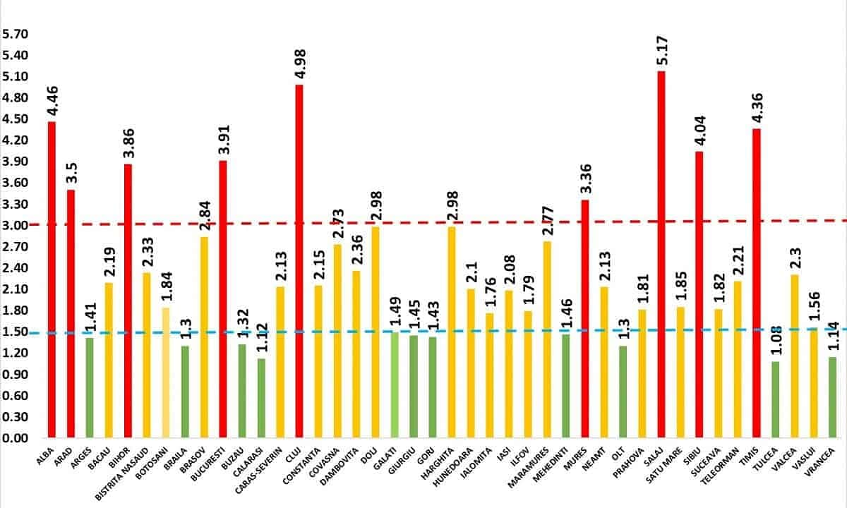 Județele cu incidență de peste 3 la mia de locuitori în ultimele 14 zile sunt: