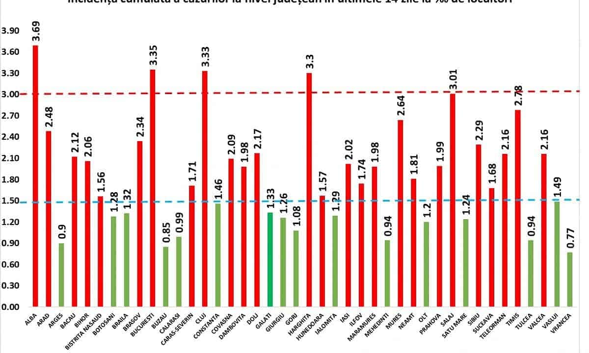 Județele cu incidență de peste 3 infectări la mia de locuitori în ultimele 14 zile sunt Alba (3,69), Cluj (3,33), Harghita (3,3) și Sălaj (3,01).