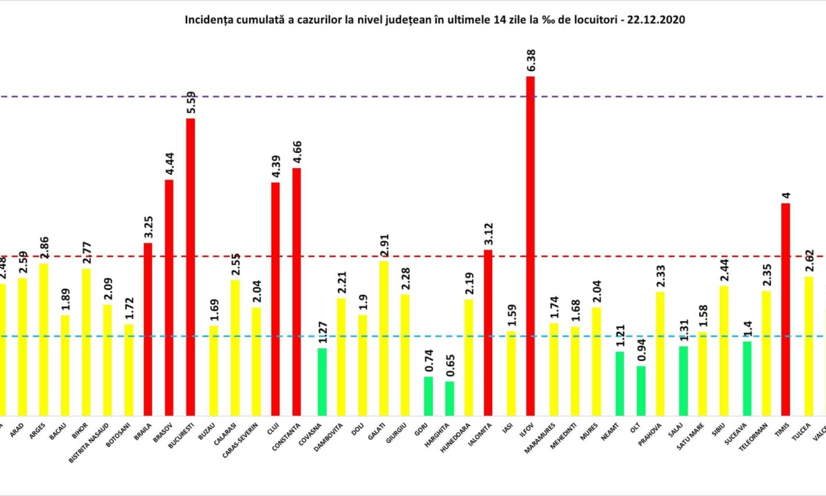 Grupul de Comunicare Strategică (GCS) a transmis marți, 22 decembrie, situația incidenței cazurilor COVID pe județe, actualizată.
