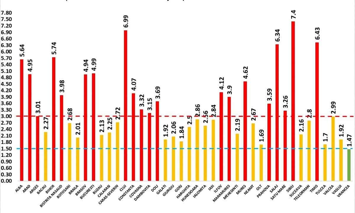 GRAFIC: Topul județelor cu incidența cea mai mare a cazurilor COVID. Date oficiale din 12 noiembrie