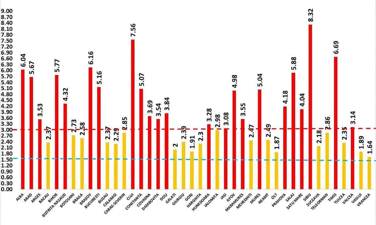 Coeficientul infectărilor cumulate la 14 zile, raportate la 1.000 de locuitori este calculat de către Direcțiile de Sănătate Publică, la nivelul Municipiului București și al județelor.
