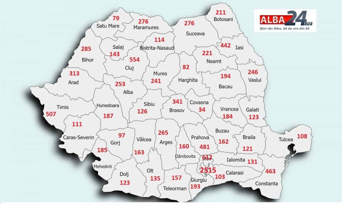 În restul țării, județele cu cele mai multe cazuri sunt Cluj (554), Timiș (507), Prahova (481), Constanța (463) și Iași (442).
