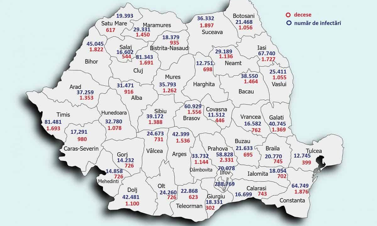 Urmează Suceava cu 1.897 de decese, Constanța - 1.876, Bihor - 1.822, Maramureș - 1.450 și Sibiu - 1.388.