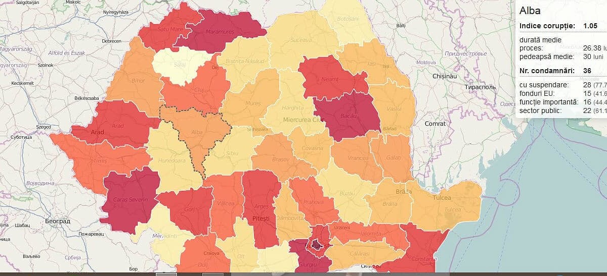 Județul Alba pe HARTA CORUPȚIEI: Cei mai mulți inculpați au ocupat funcții publice. Majoritatea au primit pedepse cu suspendare